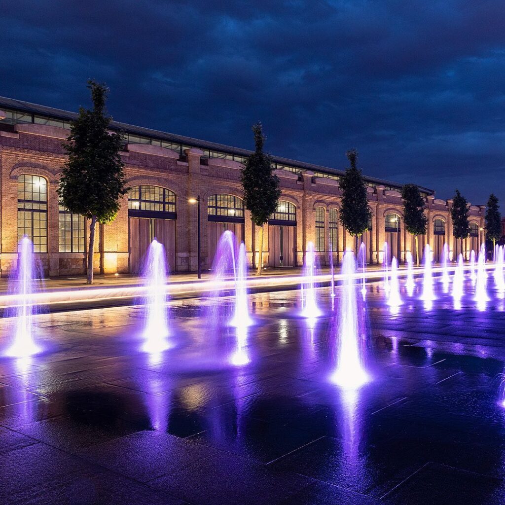 El espacio más importante disponible ya es la Plaza de las Artes, que se sitúa cerca las cuatro naves ferroviarias que acogerán equipamientos públicos. Una gran fuente recibe al visitante para luego transformarse en un canal que conduce hasta una alquería al fondo, junto a las vías. Esta se destinará a las oficinas del parque.