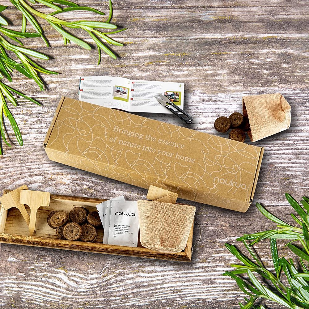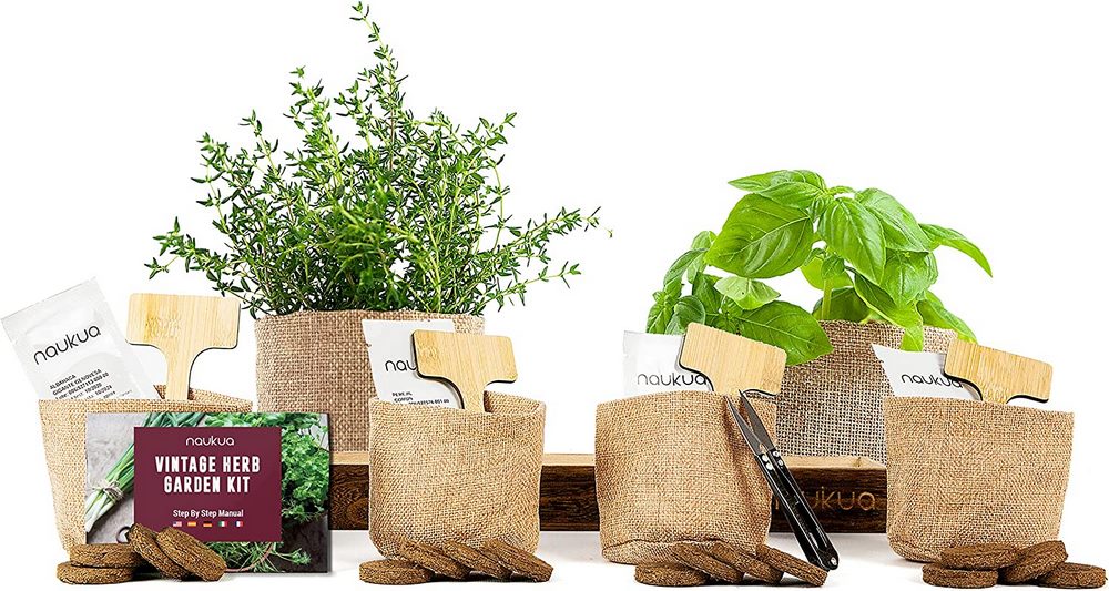 Contiene 4 tipos de semillas 100% orgánicas: Tomillo, albahaca, perejil y cilantro. Bandeja de madera estilo vintage, 16 tacos de tierra, 4 macetas de yute con forro impermeable, 4 marcadores de bambú, tijeras de podar y manual de Instrucciones paso a paso.