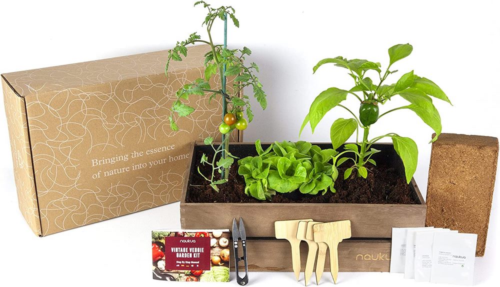 Contiene 4 tipos de semillas 100% orgánicas: Lechuga, rábanos, pimientos verdes y tomates cherry. Una jardinera de madera estilo vintage, bloque de humus de lombriz, 4 marcadores de bambú, tijeras de podar y manual de instrucciones paso a paso.