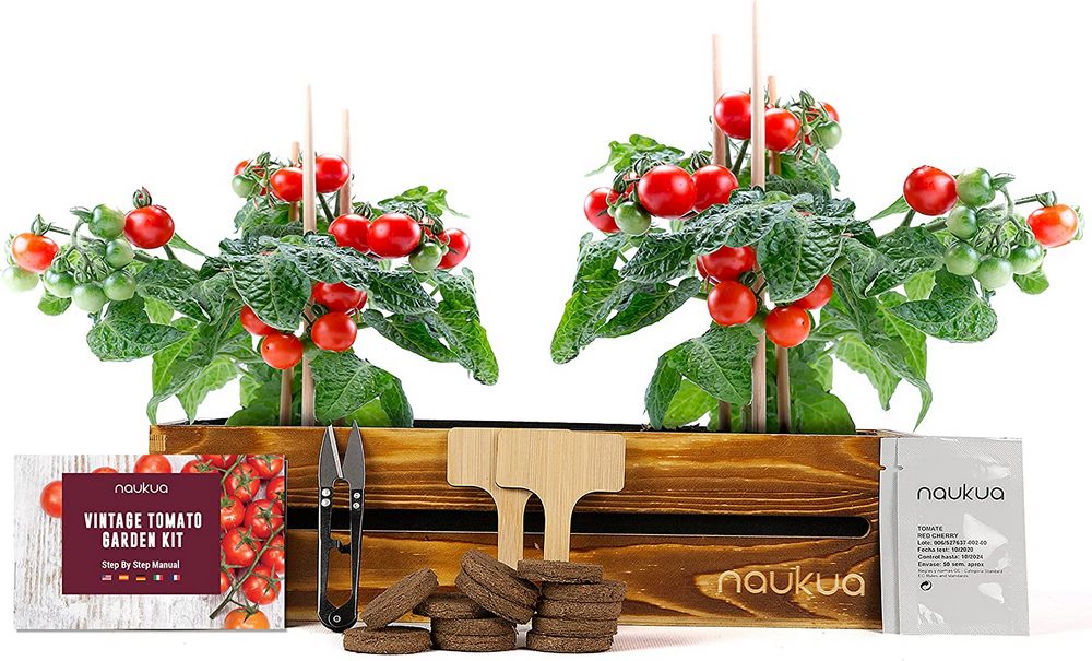 Contiene 2 sobres de semillas 100% orgánicas de tomates cherry. Una jardinera de madera con malla geotextil, 16 discos de tierra, 2 marcadores de bambú, tijeras de podar y manual de instrucciones paso a paso.