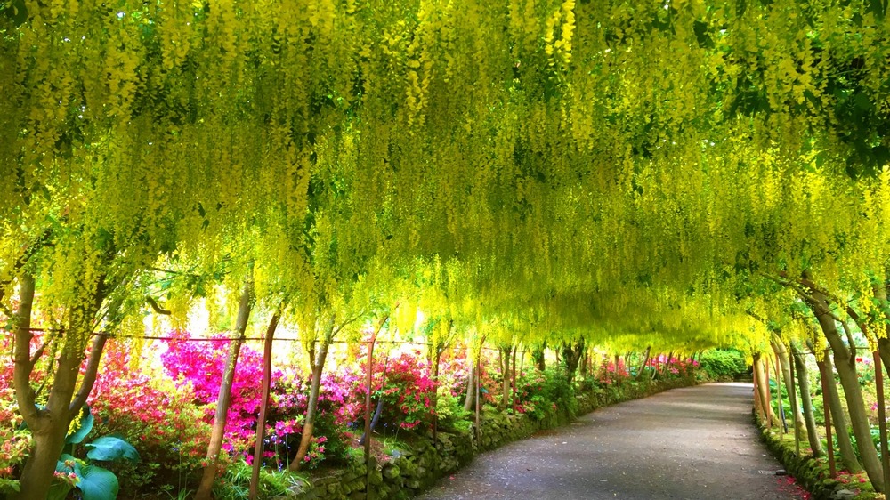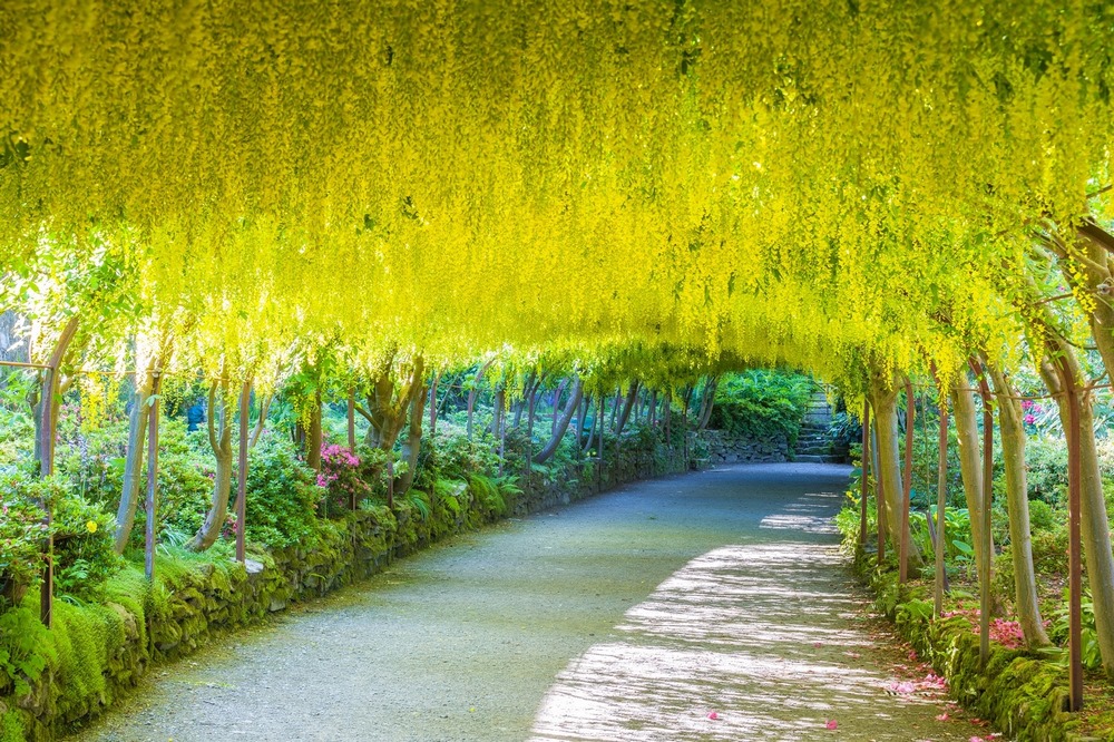 Entre los aspectos más destacados de la primavera en Bodnant Garden, uno de los jardines británicos más valorado por sus colecciones botánicas, se encuentra la floración del Laburnum Arch a finales de mayo y principios de junio. Esa pérgola, de 55 metros de largo, se cubre de largos racimos colgantes de flores amarillas, dando forma al túnel de flores de laburno más antiguo y largo del Reino Unido.