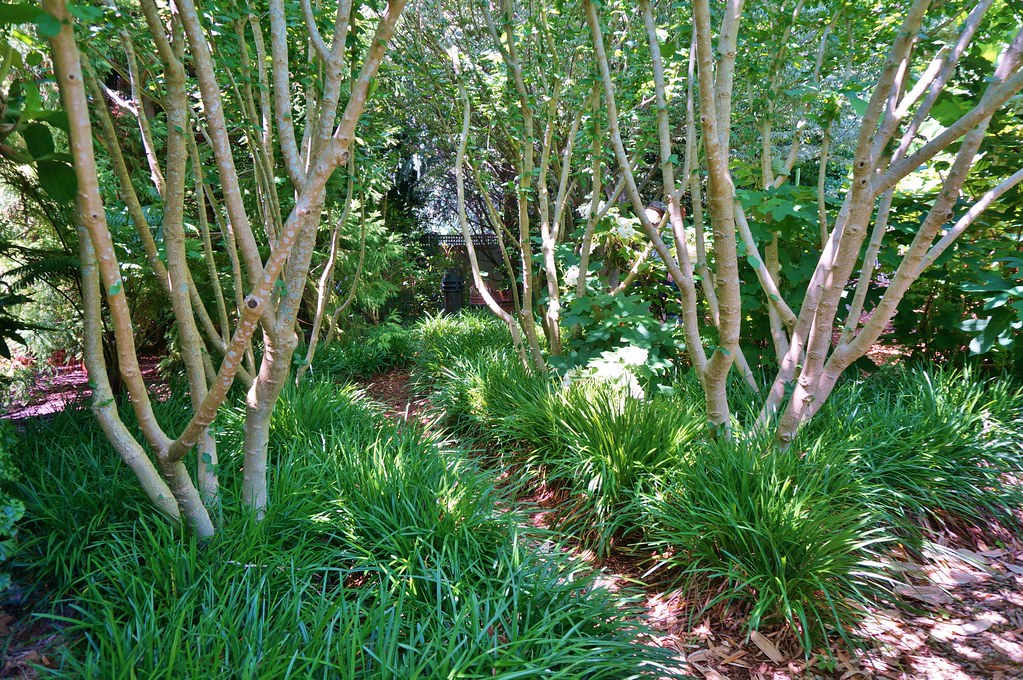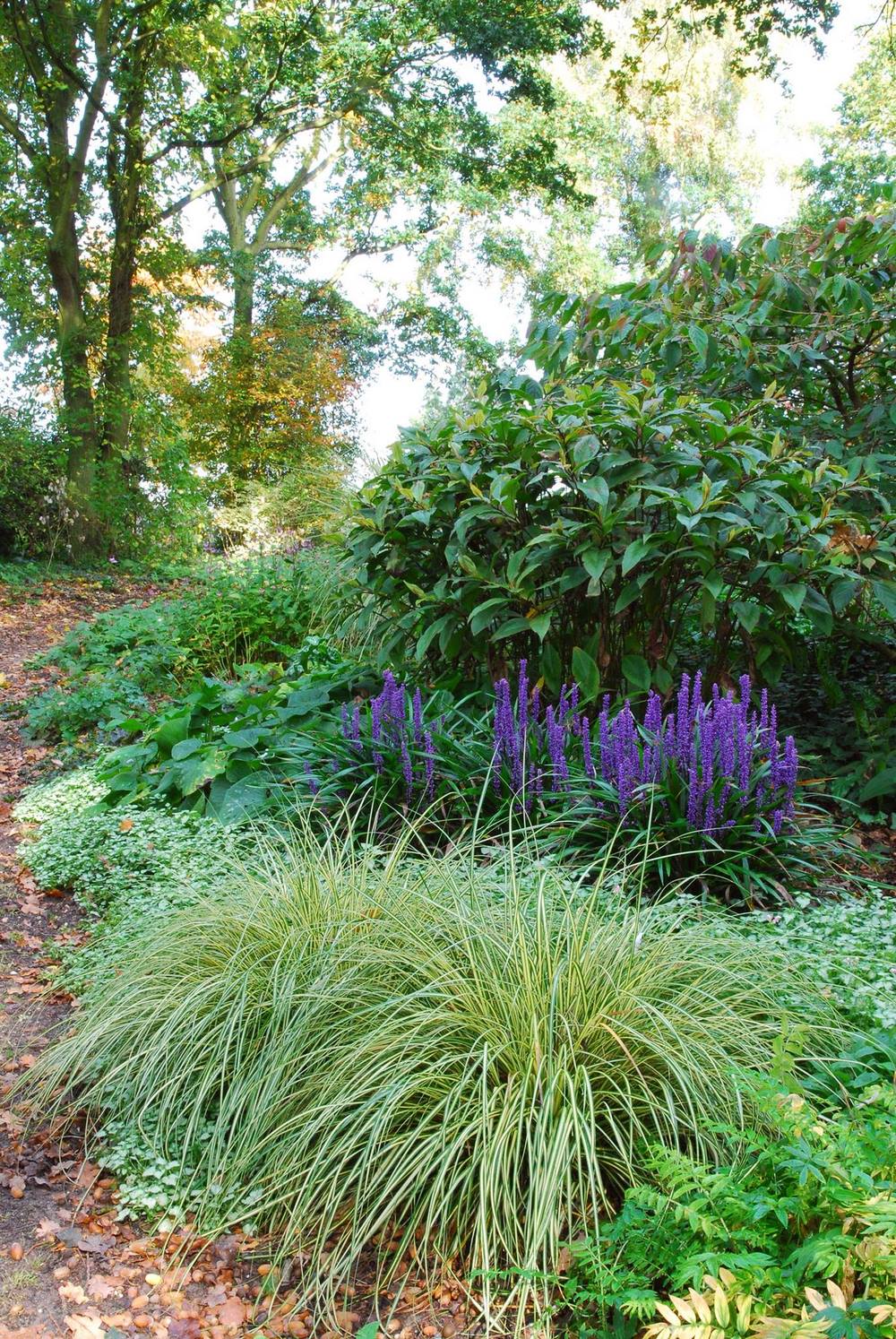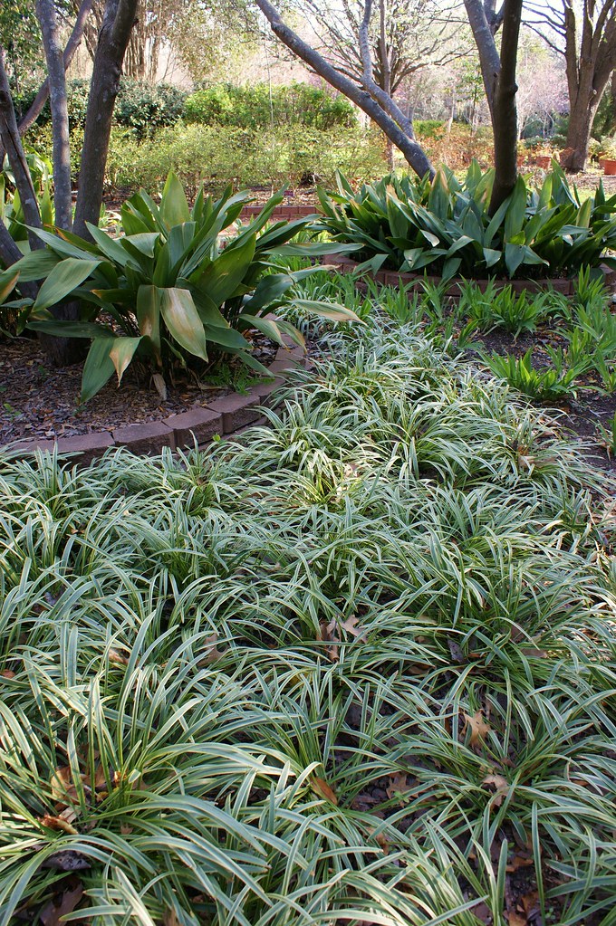 Las hojas estrechas acintadas de color verde oscuro de los liriopes forman una ordenada alfombra, lo que las convierte en una excelente cobertura de suelo.