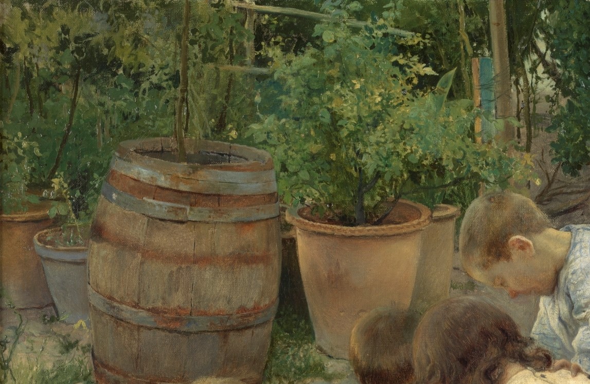 Esta pintura de José Jiménez Aranda (Sevilla, 1837 – Sevilla, 1903) es una obra pionera de temática infantil en huertos o jardines rurales de Alcalá de Guadaira, en Sevilla, en la que el pintor se embarca en el realismo naturalista tras haber abandonado la “pintura de casacón”, una vertiente de la pintura de género de la segunda mitad del siglo XIX que tiene como inspiración una imagen idealizada del siglo XVIII y que aparece protagonizada por toreros, gitanos, manolas, goyescas, sacerdotes y demás personajes del imaginario dieciochesco.