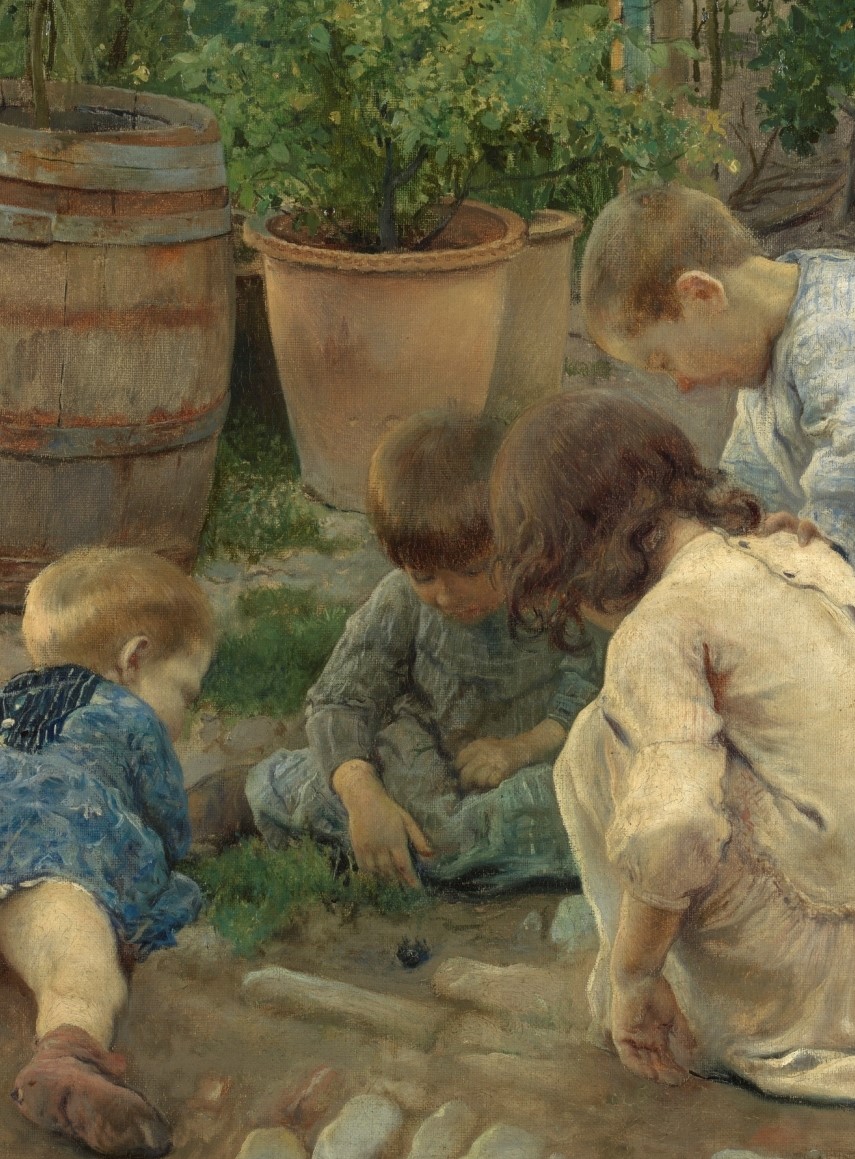 La obra muestra un escenario natural en la que los niños juegan y se concentran, ajenos a ser observados por el artista que los pinta o el espectador que los contempla, y lo hacen como si fueran entomólogos, observando a un escarabajo en el huerto de una casa de campo.