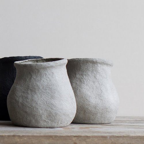 La maceta de papel que presento hoy está hecha exclusivamente de papel maché reciclado, con un interior lacado para que sea completamente impermeable. No tiene orificio de drenaje, por lo que su destaco mejor su uso como macetero. Los maceteros están disponibles en diferentes tamaños, y en color natural o negro.
