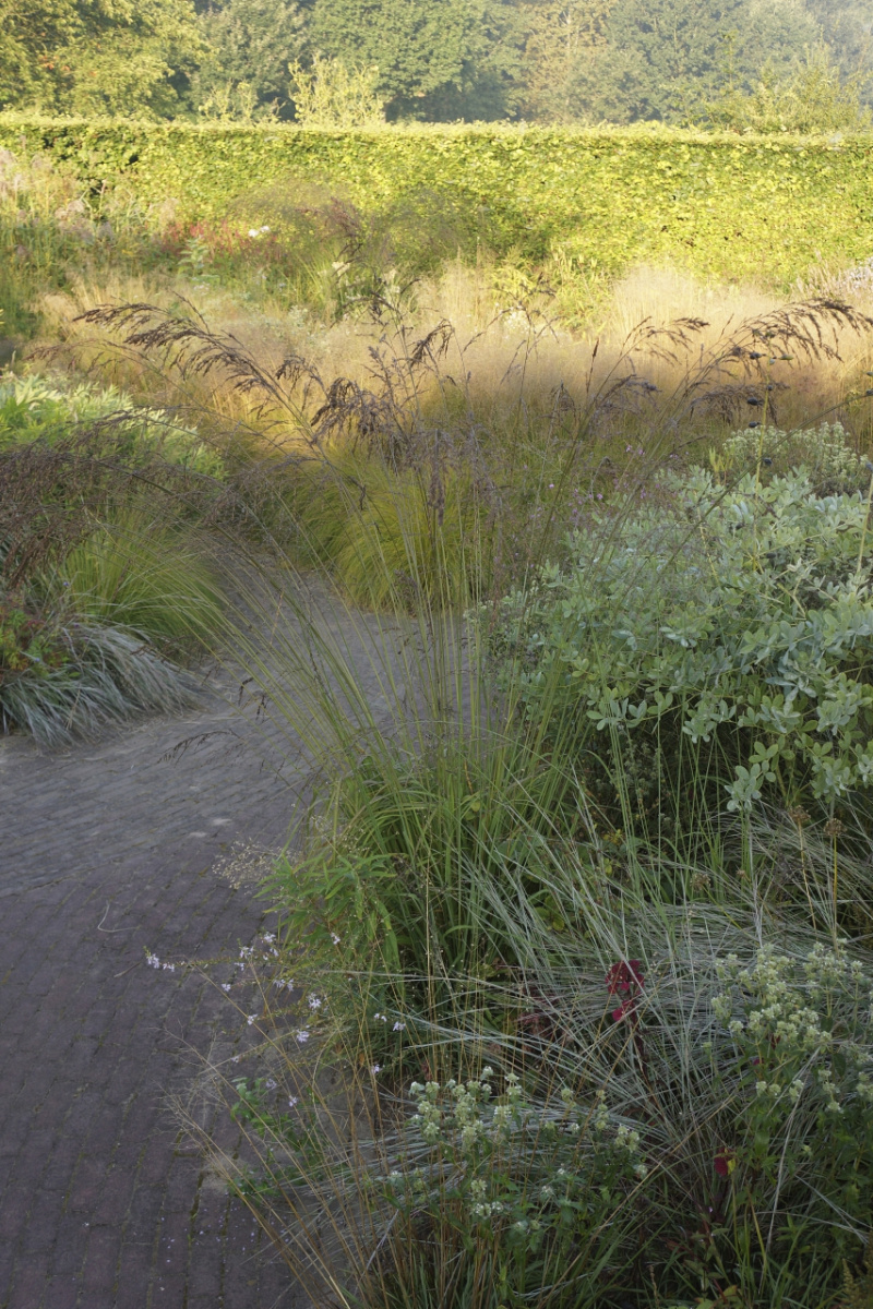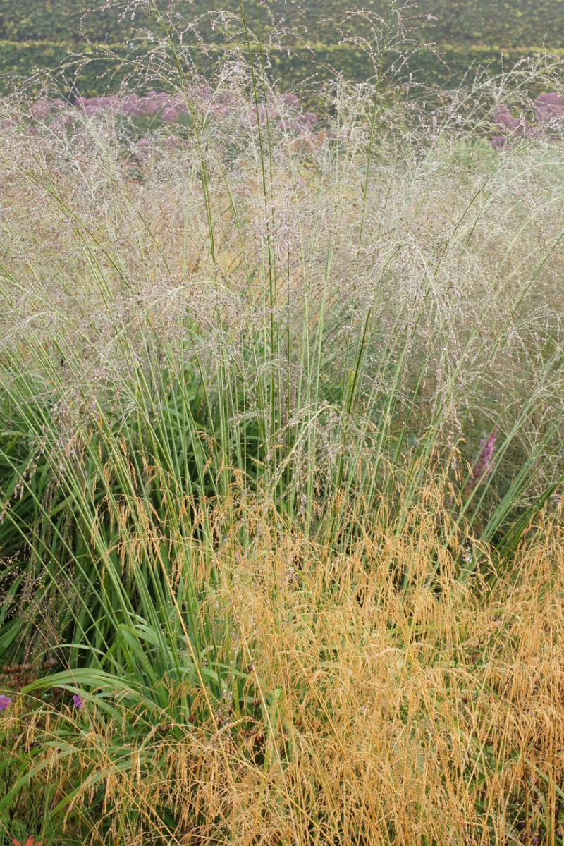 Hablan también en ese libro de una plantación en el jardín de Piet Oudolf en Hummelo al final del verano, donde Molinia arundinacea ‘Transparent’ forma una masa de tallos sólida y, al mismo tiempo, nebulosa, entre la que se entremezclan Helenium ‘Moerheim Beauty’, Aster novae-angliae ‘Violetta’ y Sanguisorba ‘Thunderstorm’.