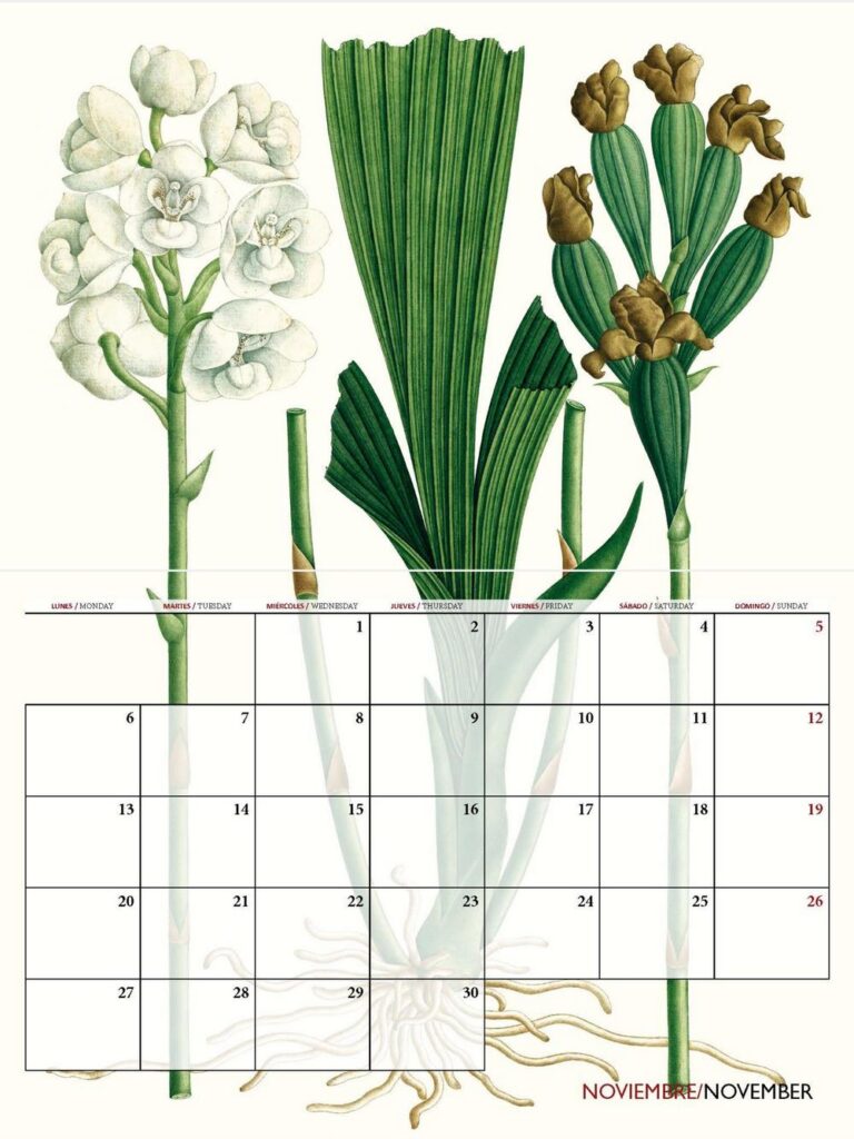 Otra de las orquídeas, Peristeria elata “Flor de Espíritu Santo”, que en el calendario ilustra el mes de noviembre, aparece en la lista de plantas enviadas por José Celestino Mutis al cónsul de Suecia en Cádiz en enero de 1777 “….esta hermosísima flor del Espíritu Santo. Es planta de tierra caliente y me la trajo el sr. D. Cristóbal de Osorio. Me parece del género Epidendrum”, escribe Mutis.