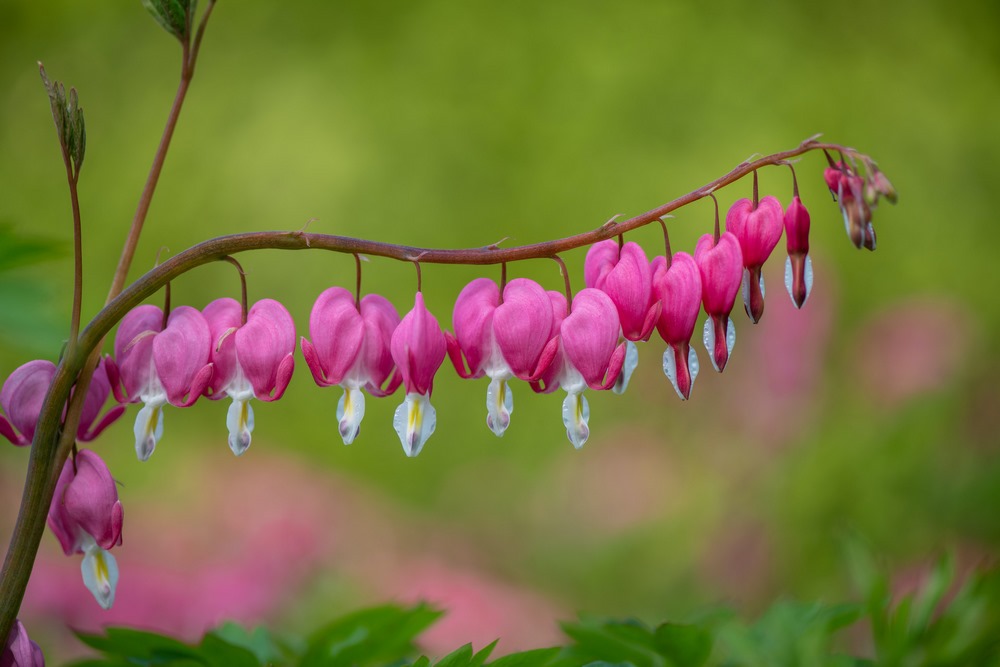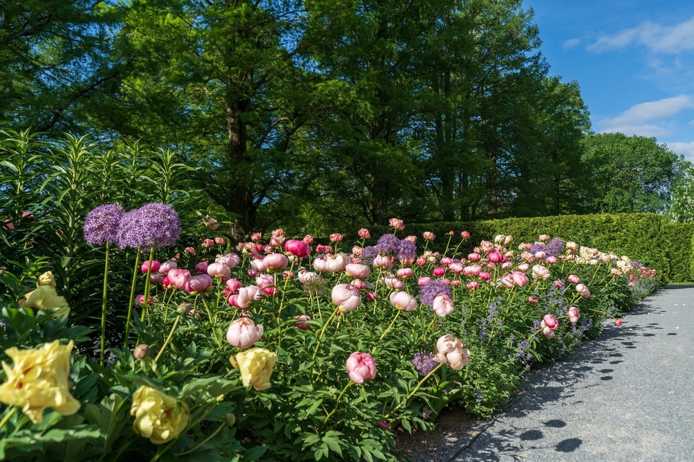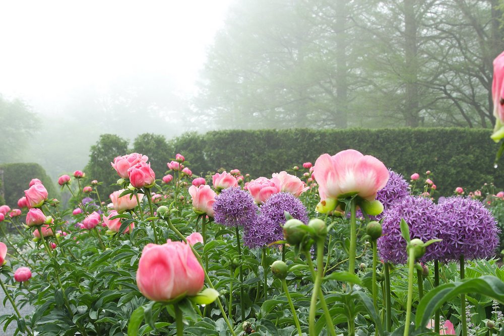 A finales de la primavera, las flores de peonías herbáceas híbridas coinciden con la vistosa floración de ajos ornamentales, como Allium Globemaster y Allium hollandicum ‘Purple Sensation’. Compitiendo en belleza, las flores de Lamprocapnos spectabilis (corazón sangrante) iluminan también el jardín.