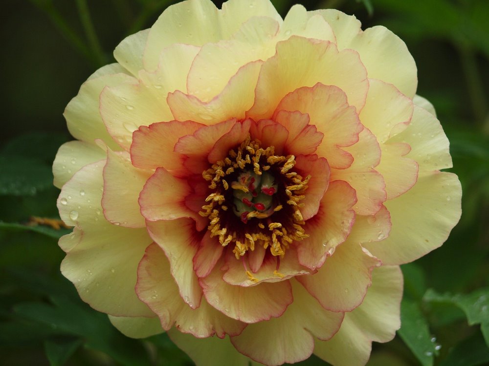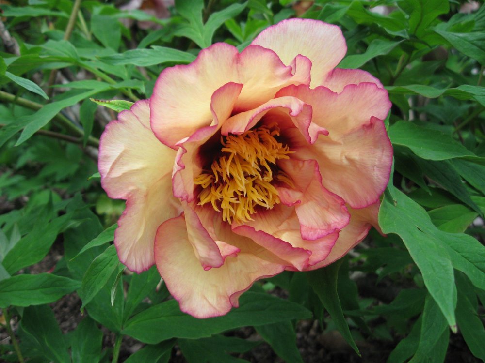 A veces llamadas peonías interseccionales o Itoh, las peonías híbridas son cruces híbridos entre peonías herbáceas y arbóreas. Tienen la forma de las hojas de las peonías arbóreas, pero pierden su parte aérea cada invierno, como lo hacen las peonías herbáceas. Además, las flores, de larga duración, son ligeramente fragantes y vienen en algunos colores únicos, como el amarillo, que no se ven en las típicas peonías herbáceas.