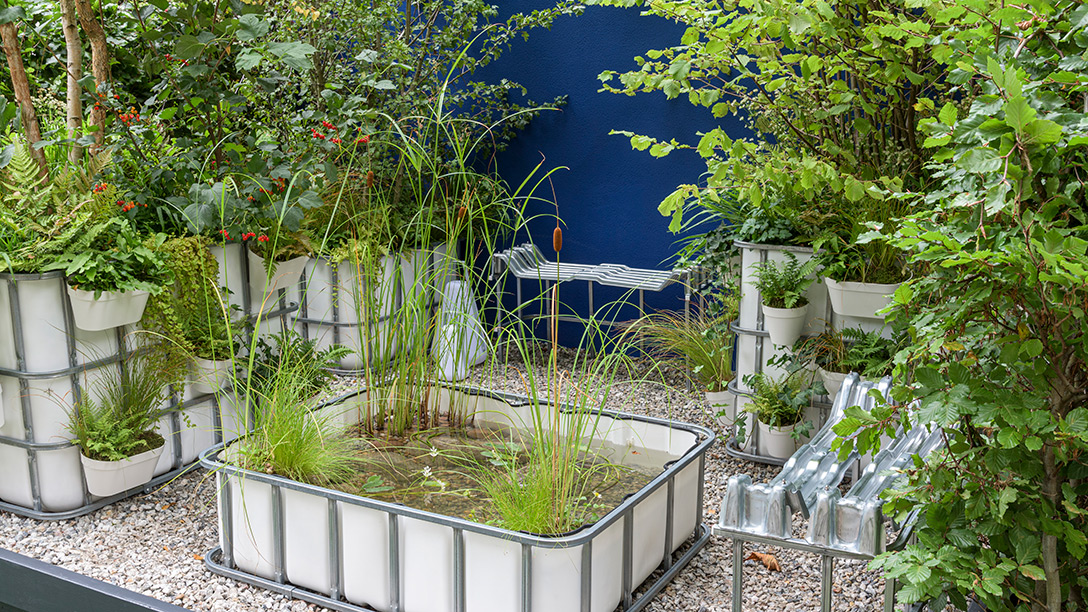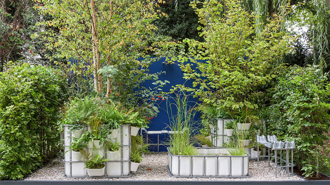El nombre del jardín, IBC, es el acrónimo en inglés de Intermediate Bulk Container (Recipiente de Forma Cúbica), que en España también se conocen con las siglas GRG, el acrónimo de Gran Recipiente para mercancías a Granel. Como es lógico, el nombre de ese jardín diseñado por Sara Edwards para Chelsea Flower Show 2021 hace referencia al tipo de contenedores usados en él, que no son otros que esos grandes recipientes para el transporte de mercancías a granel, habitualmente de plástico o metal, que permiten acopiar todo tipo de líquidos (en general contienen 1000 litros o 1000 kilos) y son muy demandados en la industria alimentaria y química. En este caso, se personalizaron contenedores reciclados, ya que resultan más económicos cuando se comprar al final de su ciclo de vida de alquiler, como sucede con los palets de madera.
