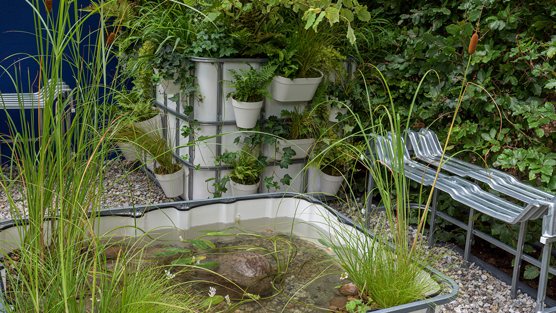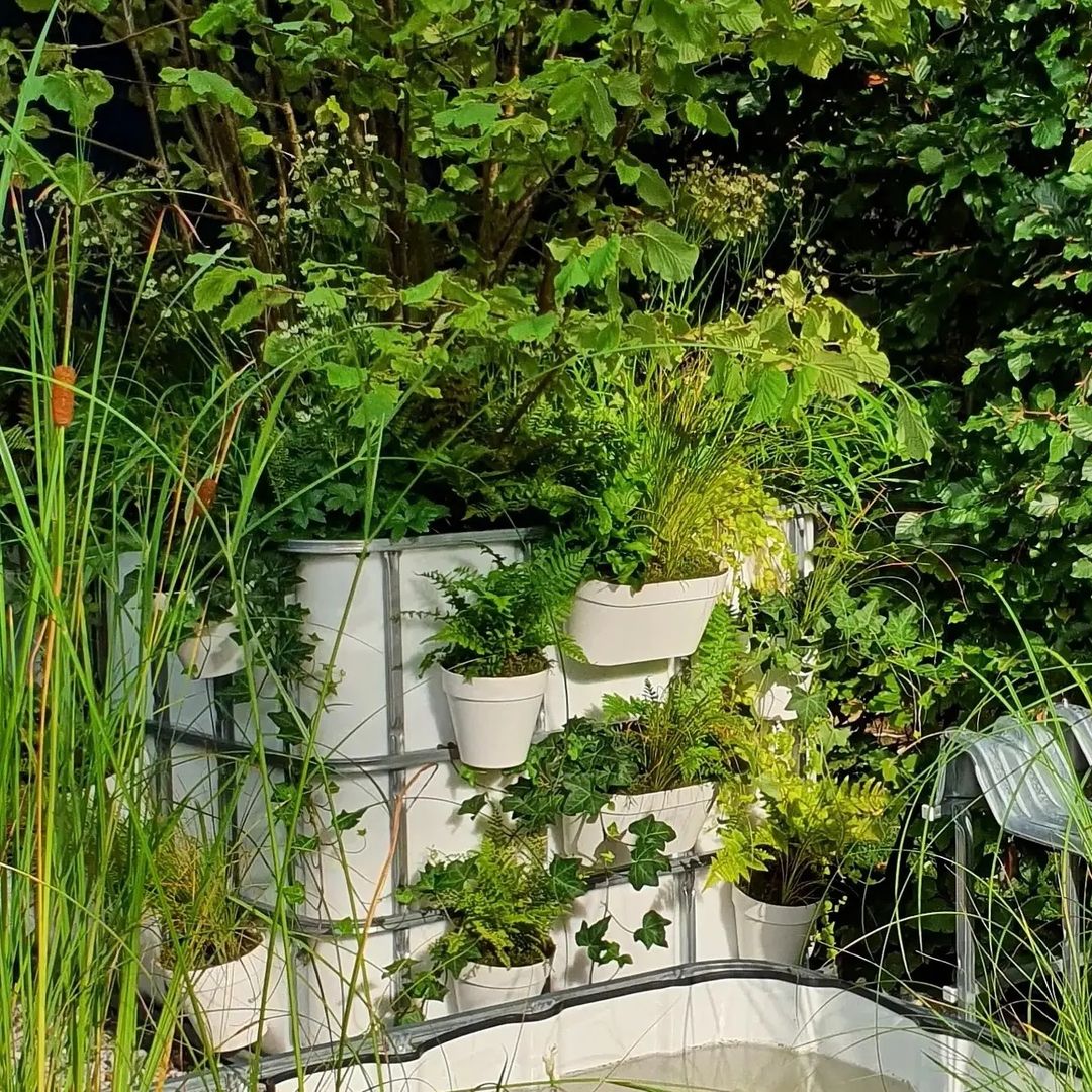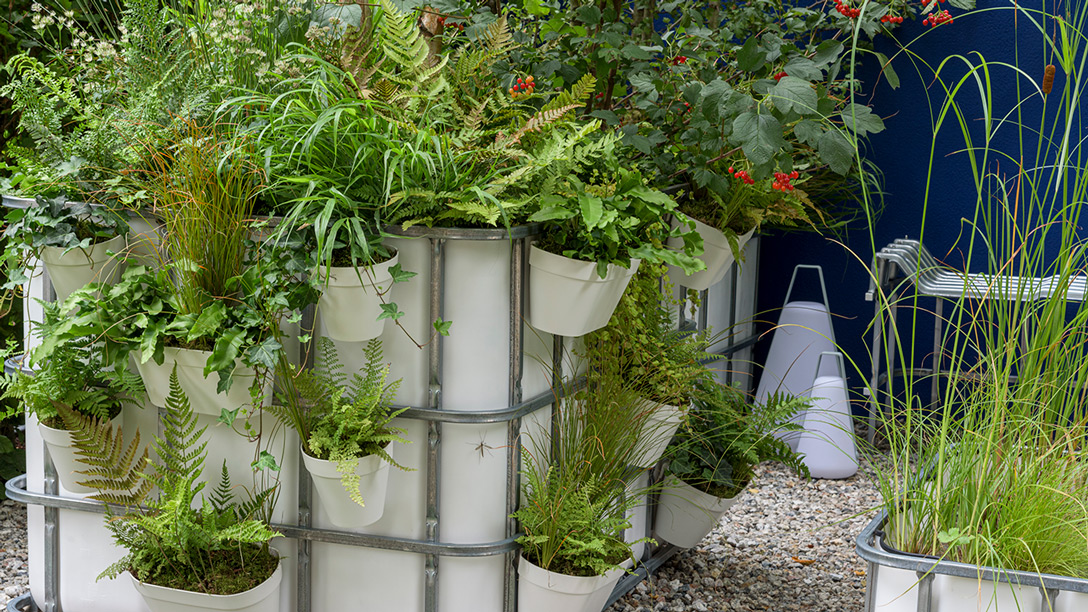 El hecho de que tengas un espacio pequeño para trabajar no significa que tengas que pensar en pequeño. Un espacio puede parecer más grande con macetas y plantas más grandes, en lugar de llenarlo con muchas más pequeñas. Desde ese punto de vista ha trabajado Sarah Edwards en el diseño de su jardín en contenedores The IBC Pocket Forest.