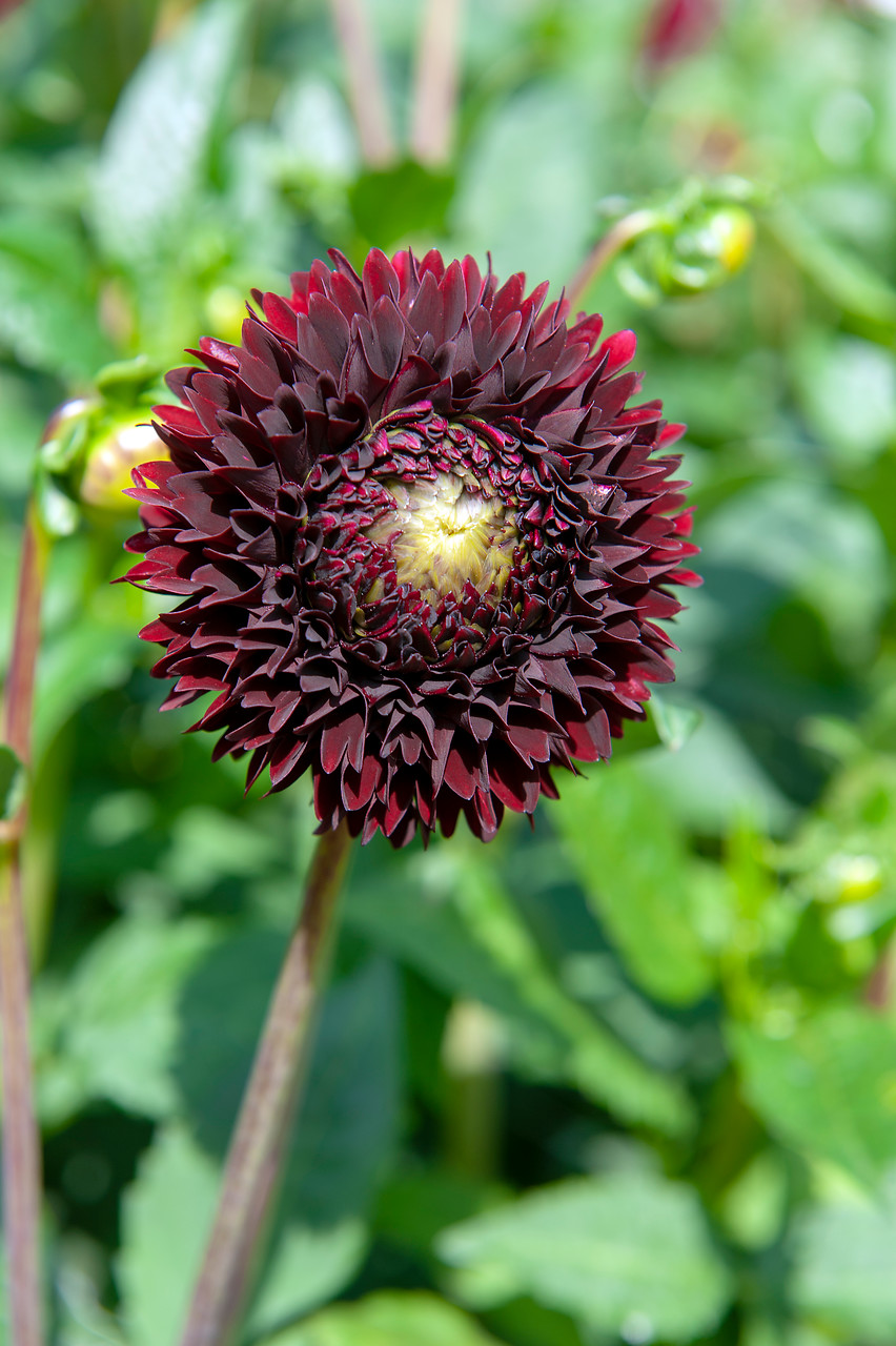 Todo dalias, todas rojas, negras o casi negras, casi todas con flor en bola o pompón, y todas preciosas, al menos a mi me lo parecen.