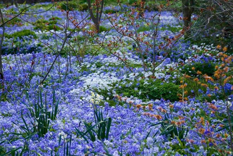 Nigel Dunnettvisitó Sissinghurst y se detuvo en uno de los jardines, situado junto al Jardín Blanco y la Priest’s House (casa del cura), denominado Delos. Allí le sorprendió la extraordinaria belleza de un mar de escilas azules (Scilla) y anémonas blancas (Anemone) que avanzan con descaro, sin que parezca haber un fin. Las fotos hablan por si solas.