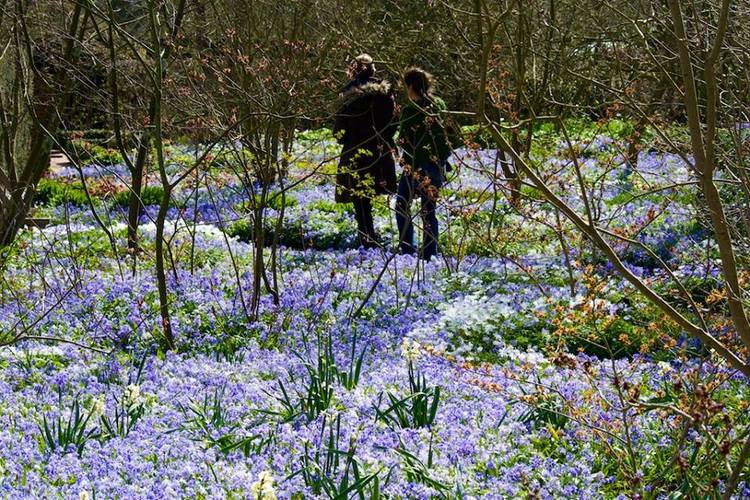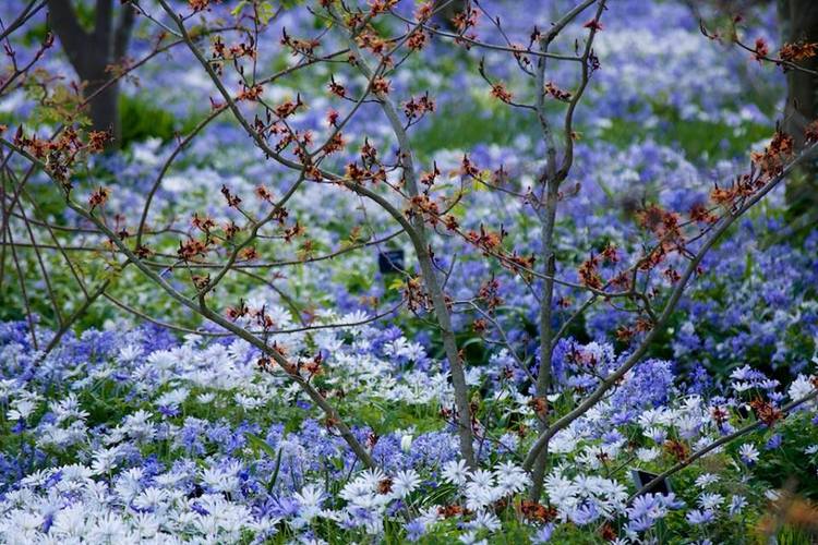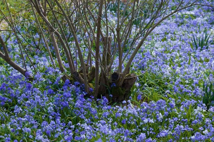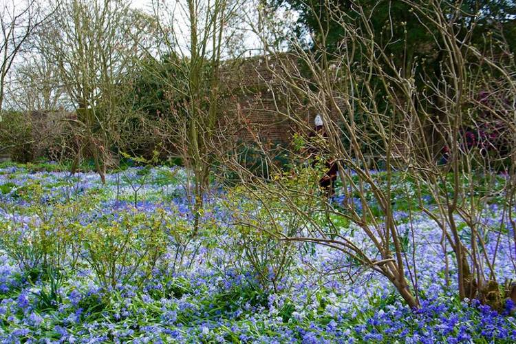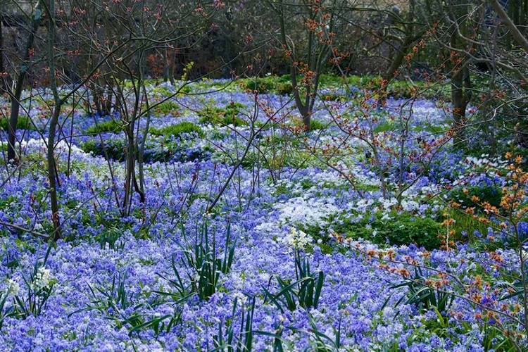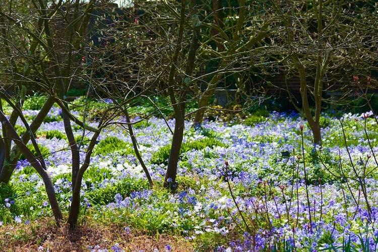Nigel Dunnettvisitó Sissinghurst y se detuvo en uno de los jardines, situado junto al Jardín Blanco y la Priest’s House (casa del cura), denominado Delos.  Allí le sorprendió la extraordinaria belleza de un mar de escilas azules (Scilla) y anémonas blancas (Anemone) que avanzan con descaro, sin que parezca haber un fin. Las fotos hablan por si solas.