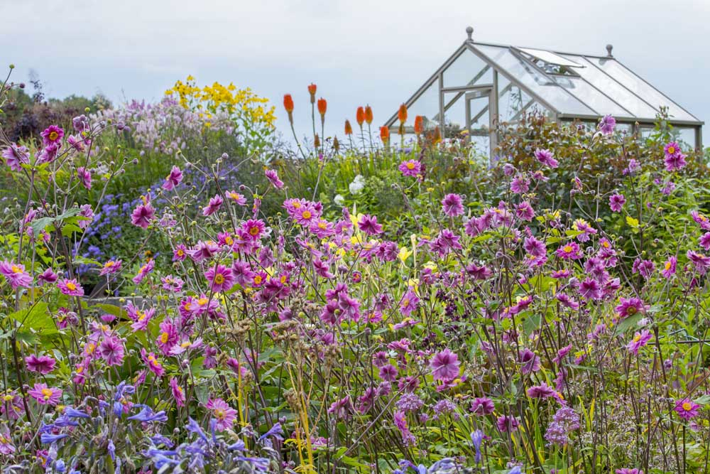 Val Bourne diseñó el jardín para que tuviera algo de interés durante todo el año. Además del jardín con bulbos de flor de primavera, creó parterres de verano con rosas, peonías, phlox y lavanda cerca de la cabaña. Una bordura otoñal de plantas vivaces de tallo rígido y gramíneas ornamentales rodean la casa de verano. Las bolas de boj son las encargadas de tomar el centro del escenario en invierno.