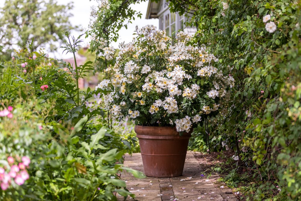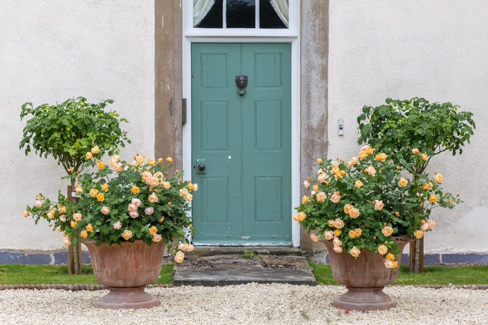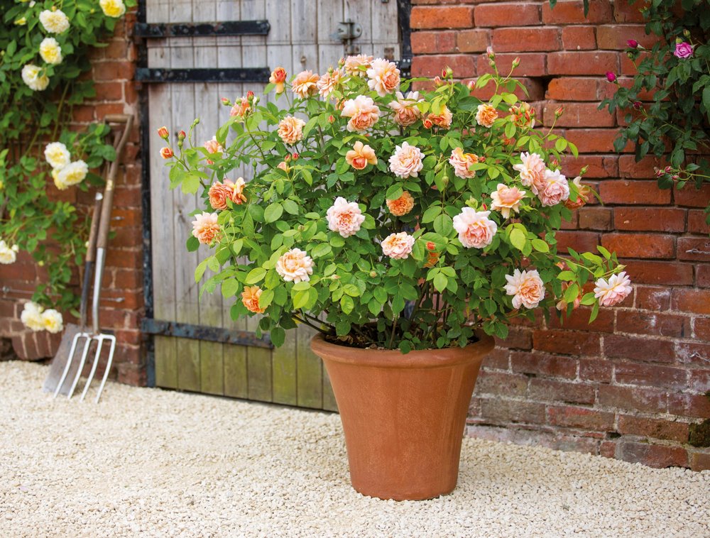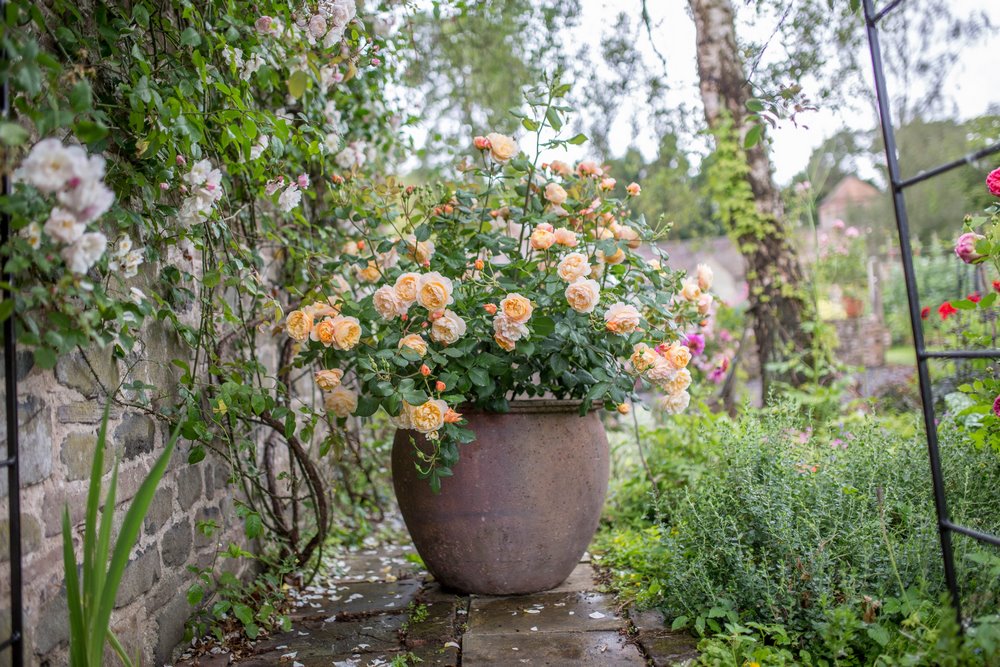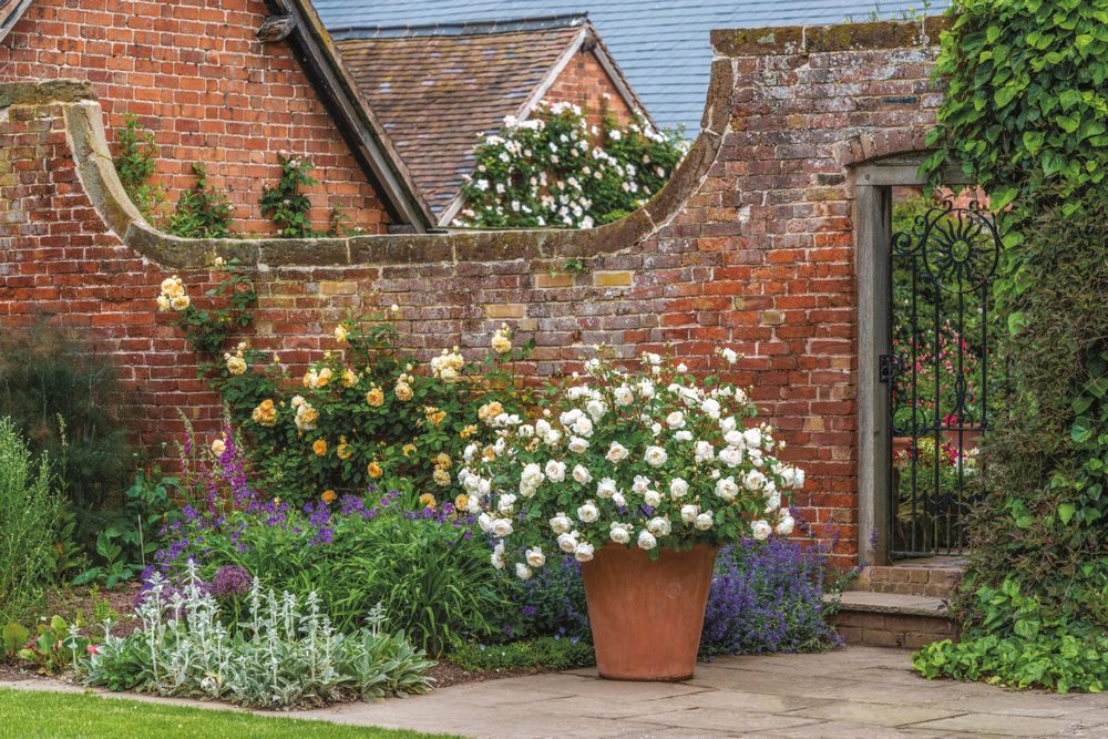 Si nos decidimos, lo primero que debemos tener en cuenta es que los rosales crecerán mejor si los cultivamos en macetas grandes y resistentes. Además, cuando vayamos a elegir el contenedor que vayamos a utilizar, es interesante seleccionarlo en función del color. En un artículo reciente, Michael Marriot, ex director de David Austin, comentaba que las rosas en tonos naranjas y los amarillos se ven mejor con macetas de terracota, pero las rosas rosadas y rojas lucen más en recipientes de roble oscuro, piedra gris o casi negros. Algo que se aprecia en muchas imágenes y, ciertamente, no le falta razón.