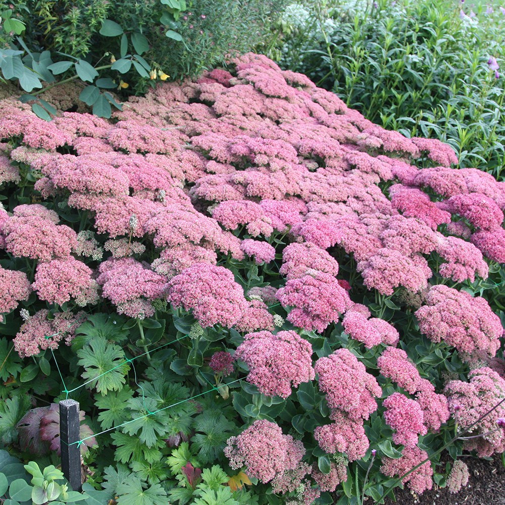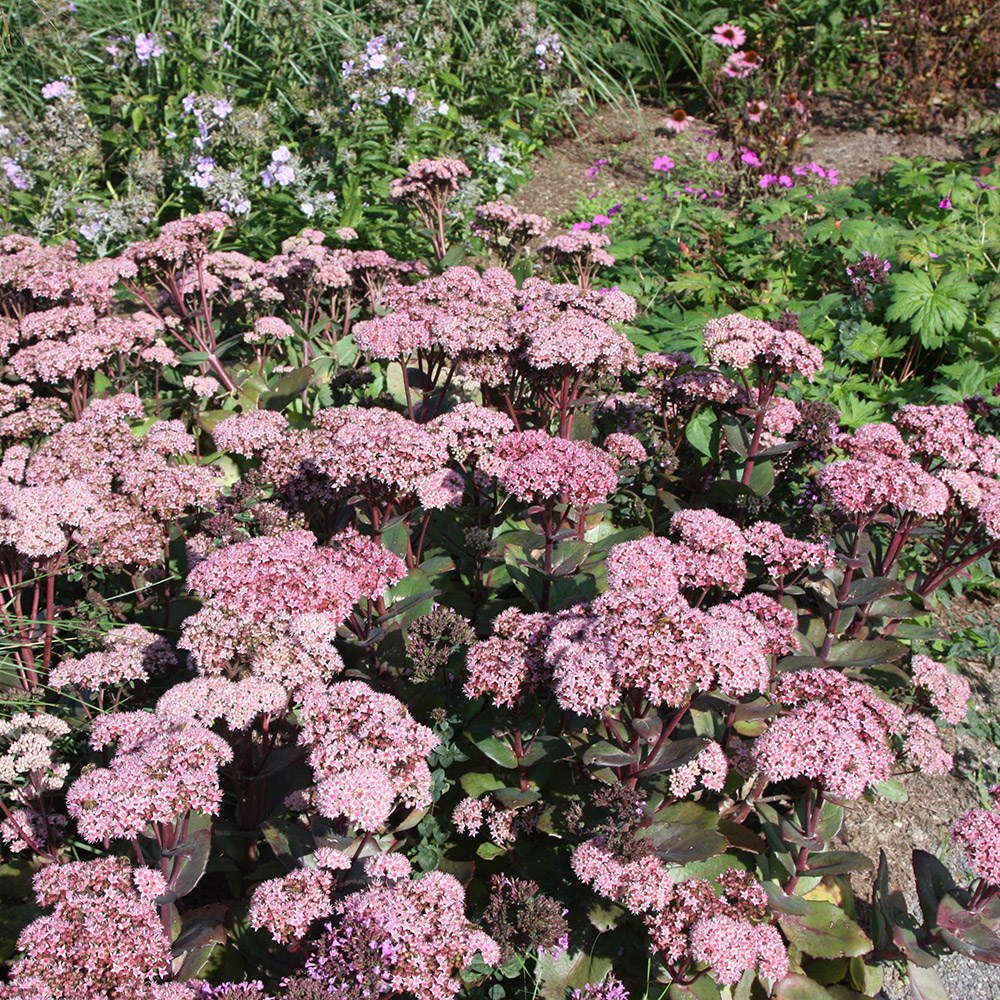 Más conocido por su sinónimo, Sedum telephium ‘Matrona’. Planta perenne de hoja caduca que crece (a pleno sol) hasta 60 cm de altura, con grandes hojas ovaladas de color gris verdoso teñidas de púrpura cerca de los márgenes, y densas agrupaciones de flores de color rosa pálido en verano y principios de otoño. Después, sus cabezas de semillas presentan un aspecto muy vistoso. También es una planta muy valorada para flor de corte.