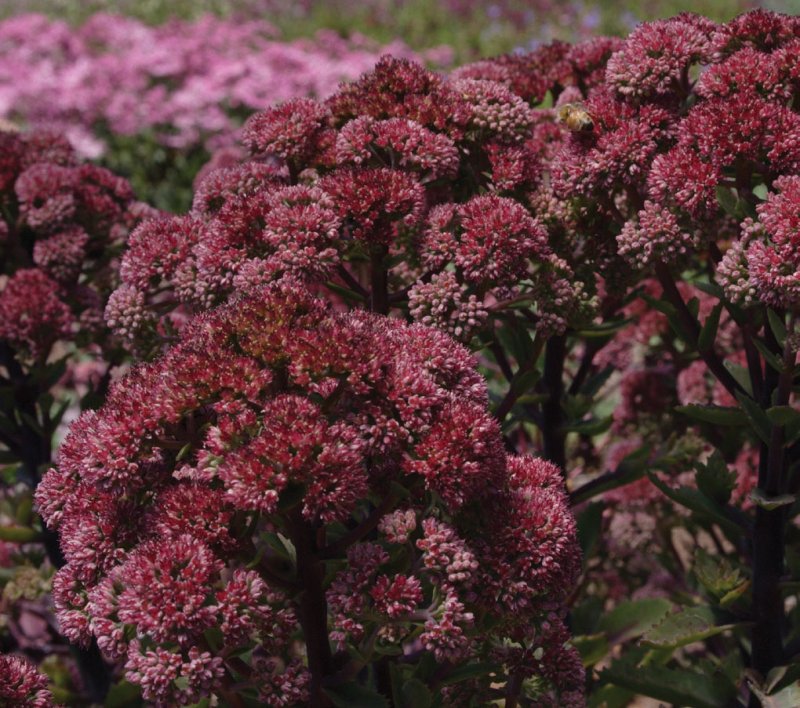 - Por último, los llamados sedums fronterizos, que incluyen aquellas especies y variedades con tallos altos (hasta 60 cm) que se emplean en fronteras y borduras mixtas. De hecho, los anglosajones suelen referirse a estos sedums como “border sedums”. Esta sección la integran plantas perennes carnosas, con raíces tuberosas y flores terminales en corimbo. Como comenté al inicio, hoy en día estas plantas ya no pertenecen al género Sedum y se clasifican dentro del género Hylotelephium. Un lío, la verdad, porque al buscar información en ocasiones se encuentran identificadas como Sedum y en otras como Hylotelephium