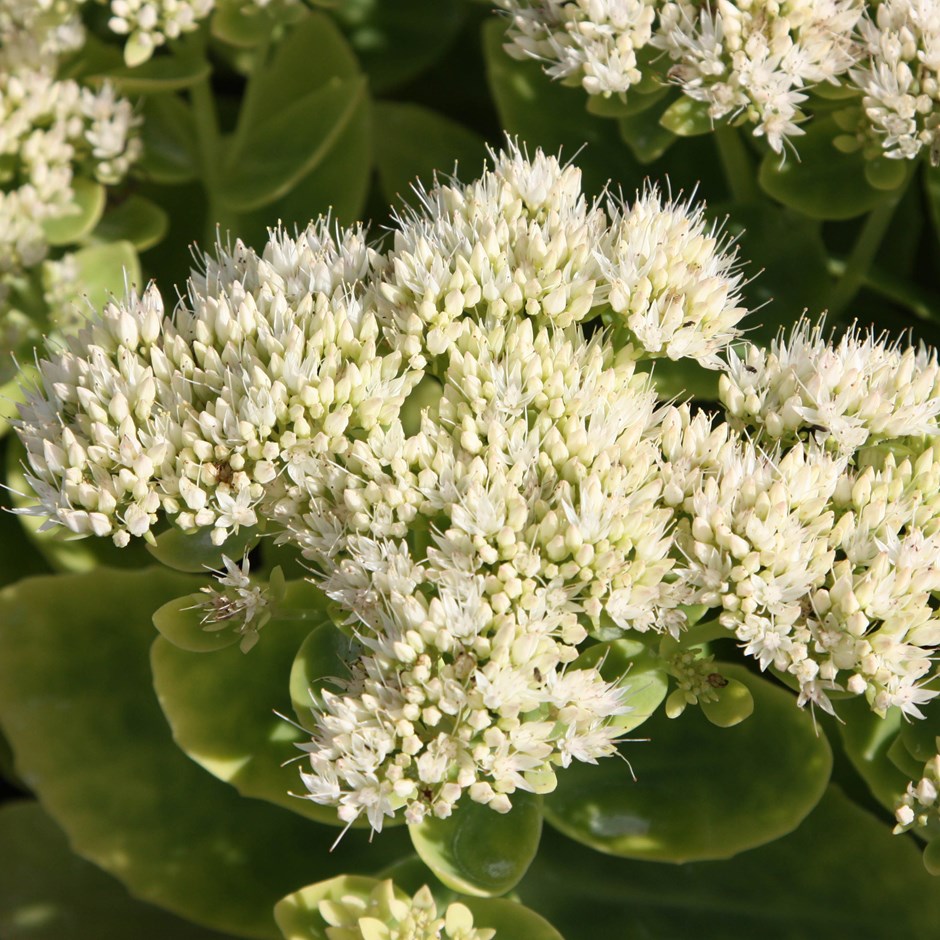 Planta perenne que forma grupos con hojas de color gris-verde. Produce grandes cabezas de flores blancas y planas, desde mediados del verano hasta noviembre. Crece, a pleno sol, hasta alcanzar una altura y extensión de aproximadamente 45 cm. Sinónimo: Sedum spectabile ‘Stardust’.