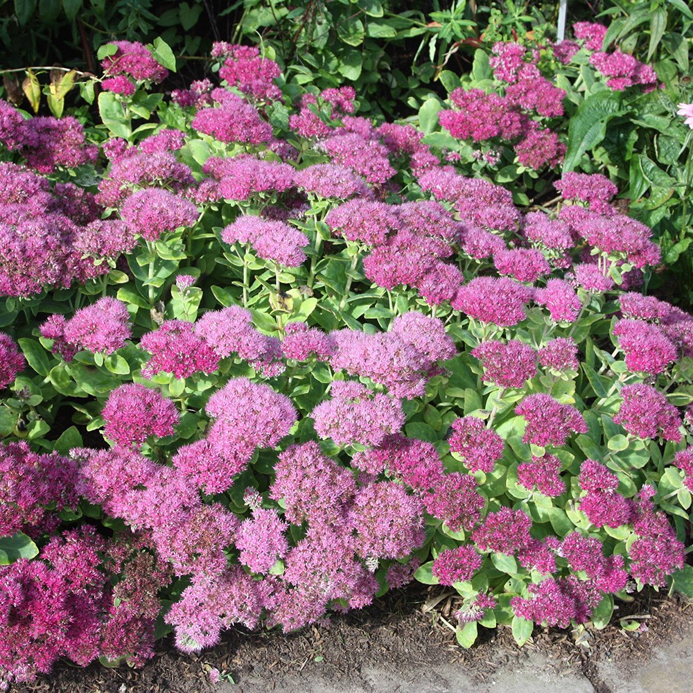 Planta herbácea perenne que forma grupos, de 45 cm de altura, con tallos gruesos y hojas suculentas de color verde grisáceo, coronadas por grandes cabezas planas de brillantes flores de color rosa malva desde finales del verano, que resultan muy atractivas para abejas y mariposas. Crece a pleno sol y puede llegar a alcanzar 0,5 metros de altura en 2-5 años.