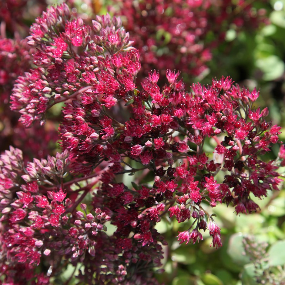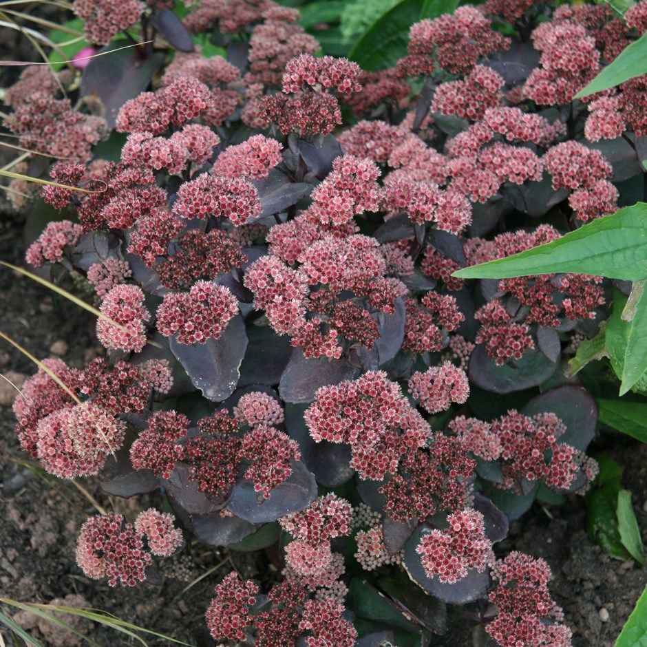 Hojas suculentas de color púrpura verdoso, inflorescencias de color rojo rubí desde mediados del verano hasta principios de otoño. De crecimiento bajo, es perfecta para suavizar el frente de un borde soleado y bien drenado. Las flores son una valiosa fuente de néctar para las mariposas y las abejas. Crece bien a pleno sol o sombra parcial. Alcanza una altura de 0,25 cm y se extiende hasta 0,45 cm.