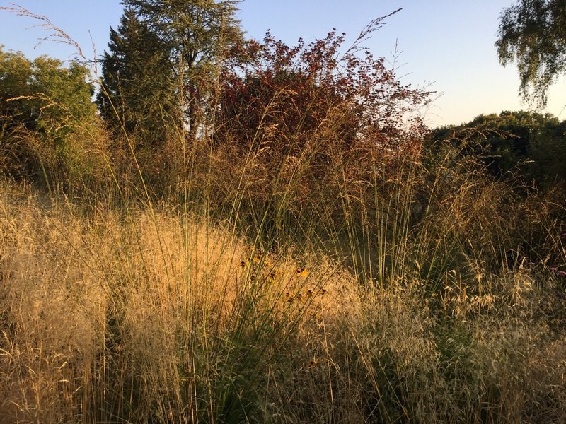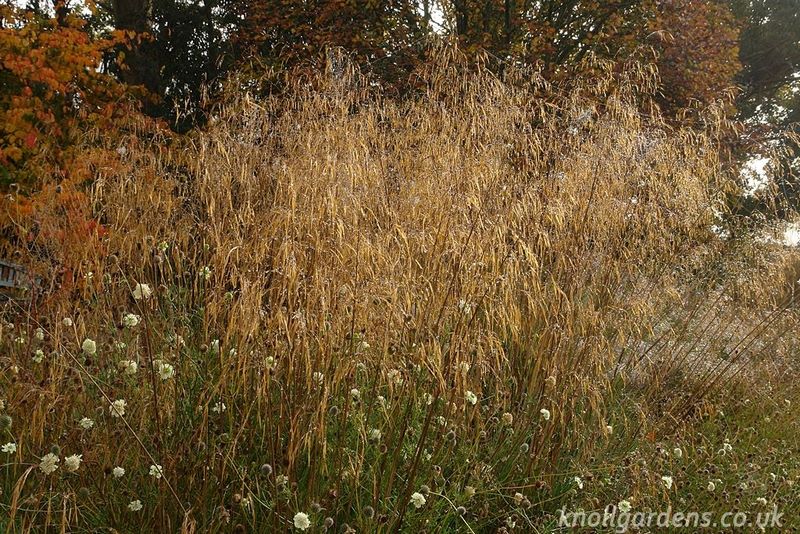 La especie Stipa gigantea está considerada una de las plantas “transparentes” más valiosas, porque hace sentir su presencia sin bloquear la vista a través de las plantas detrás de ella. Es un endemismo de la mitad oeste de la Península Ibérica y en su hábitat natural crece en zonas secas de montes de encinas del interior. Las hojas grisáceas forman impresionantes matas que maduran hacia el amarillo pálido en otoño. Crece mejor a pleno sol y no le gusta el suelo húmedo de invierno. Puede alcanzar hasta 2 metros de alto. En la imagen se muestra una selección de Stipa gigantea obtenida por el vivero alemán Ernst Pagels.