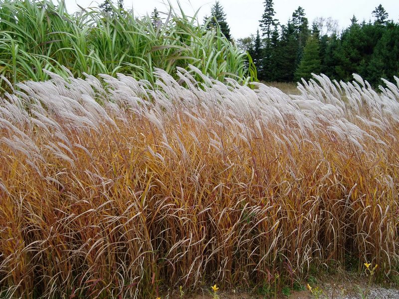 Forma densos grupos de hojas arqueadas de color verde brillante que se vuelven amarillas en otoño. Sus inflorescencias de color gris plateado se tiñen de rosa en verano y principios de otoño. Según maduran se vuelven marrones y duran hasta bien entrado el invierno. Crece mejor a pleno y alcanza 1 metro o más de altura.