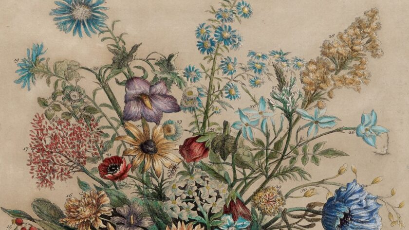 Cada flor está detallada y claramente separada de las especies que la rodean, y cada una está etiquetada con un número que corresponde con el nombre común de la flor que figura en la parte inferior.
