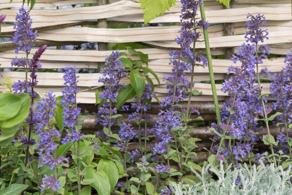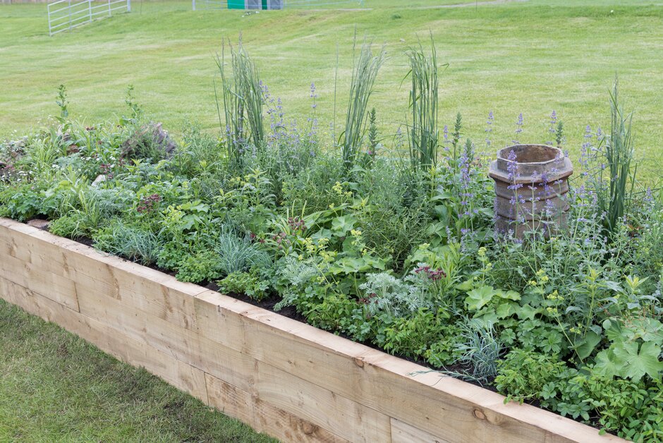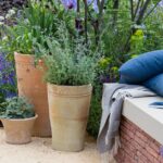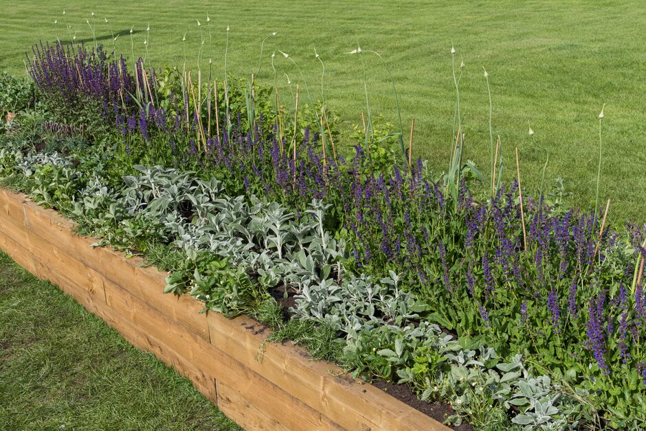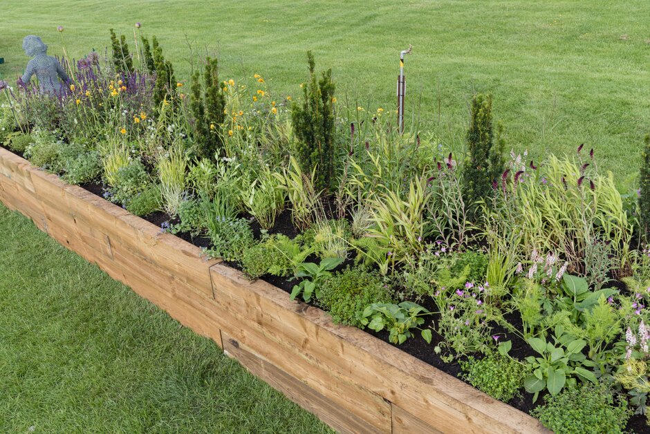 Lo cierto es que Hardwick Hall es el hogar de varias fronteras de herbáceas amuralladas y es especialmente famoso por su jardín de hierbas. En esta bordura, ese aspecto se ha tenido en cuenta. Los paneles proporcionan una espina dorsal a la plantación, dando una sensación de cerco para representar los jardines amurallados. Las hierbas juegan un papel estructural clave y agregan aroma culinario con una selección de hierbas utilizadas en la época isabelina, mezclada con plantas vivaces y toques de color de lirios, amapolas altas y Paeonia lactiflora ‘Honey Gold’.