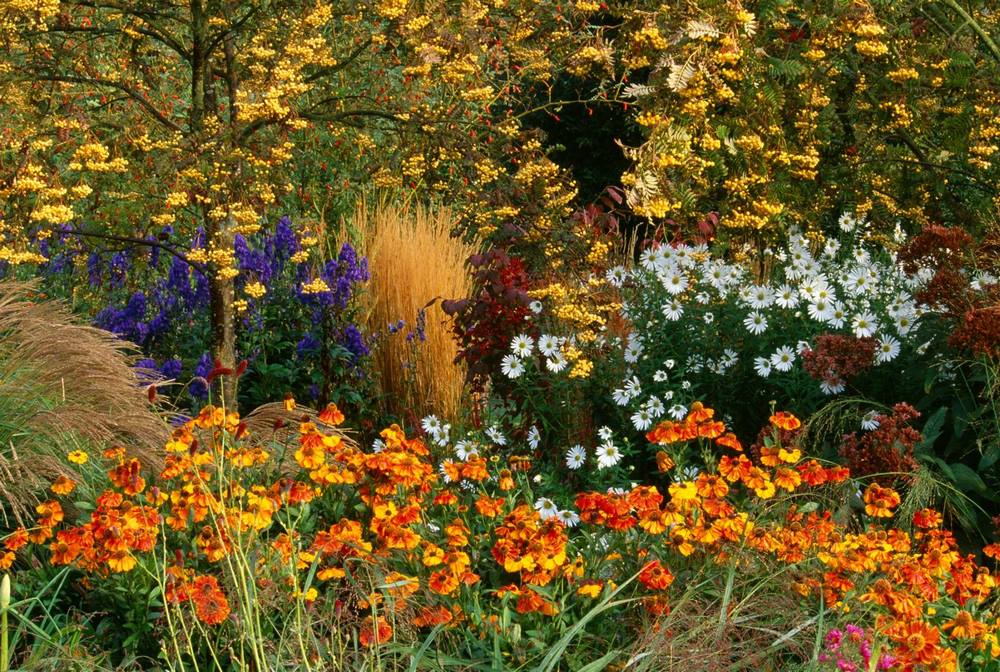 En este caso, esta bordura de otoño se crea con una buena representación de variedades de Aster que se unen a otras especies y cultivares que incluyen Aster novi-belgii ‘Erica’, ‘Alma Potsche’, ‘Autumn snow’, ‘Marie Ballard’, ‘King George’ y ‘Fritatii Monch’. A los ásteres se unen, entre otras especies y cultivares, Helianthus, Solidago, Rudbeckia, Veronicastrum, Helenium y Nepeta.