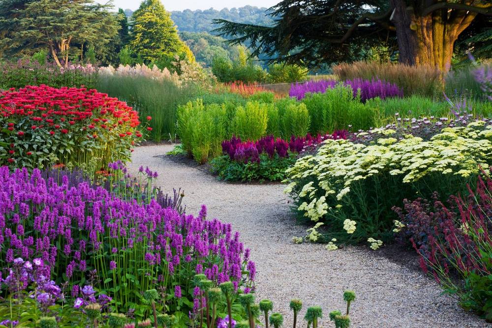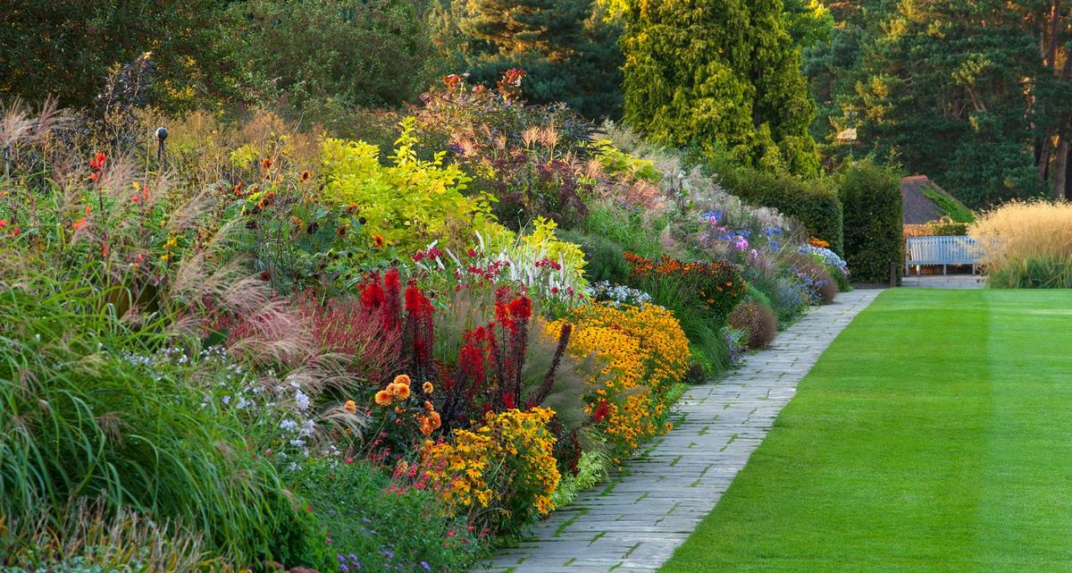 La imagen muestra la bordura de herbáceas perennes en uno de los jardines de RHS Wisley, el llamado Bicentenary Glasshouse garden diseñado por Tom Stuart-Smith.