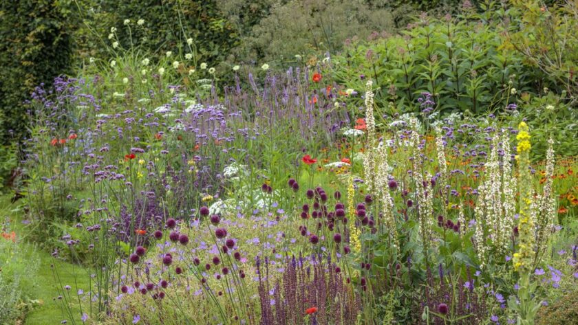 En esta ya popular foto, capturada por Jonathan Buckley en el espectacular jardín amurallado diseñado por Tom Stuart-Smith en Broughton Grange, se muestra una bordura de herbáceas en la que algunas de las plantas protagonistas son Eryngium x zabelii, Allium sphaerocephalon y Taxus baccata ‘Fastigiata’.