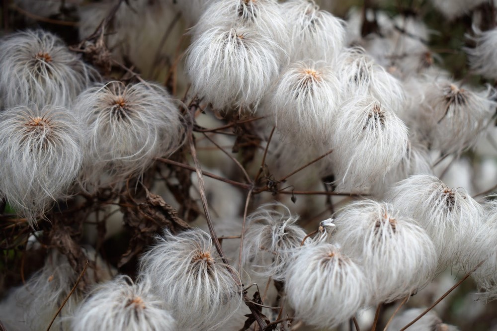 Un bellísimo espectáculo el ofrecen las cabezas de semillas con borlas sedosas de algunas variedades de clemátide, que además duran desde el otoño hasta el invierno para agregar interés visual al jardín. Ver más sobre el género Clematis.
