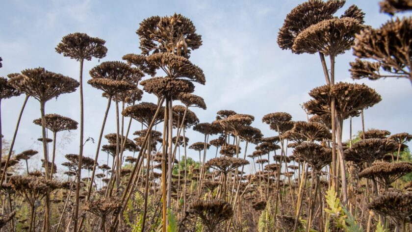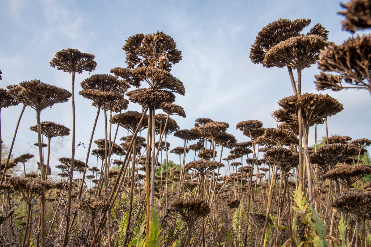 También hablé hace ya seis años de la importancia de saber disfrutar de las cuatro estaciones en el jardín y apreciar, como diría Piet Oudolf, que el marrón también es un color, aludiendo al hecho de que suele trabajar con plantas cuya vegetación envejece y muere con belleza. En ese grupo de plantas se incluyen aquellas herbáceas cuyas cabezas de semillas aportan, desde el punto de vista ornamental, belleza y estructura, al tiempo que los tallos de algunas de ellas proporcionan acento vertical a la plantación.