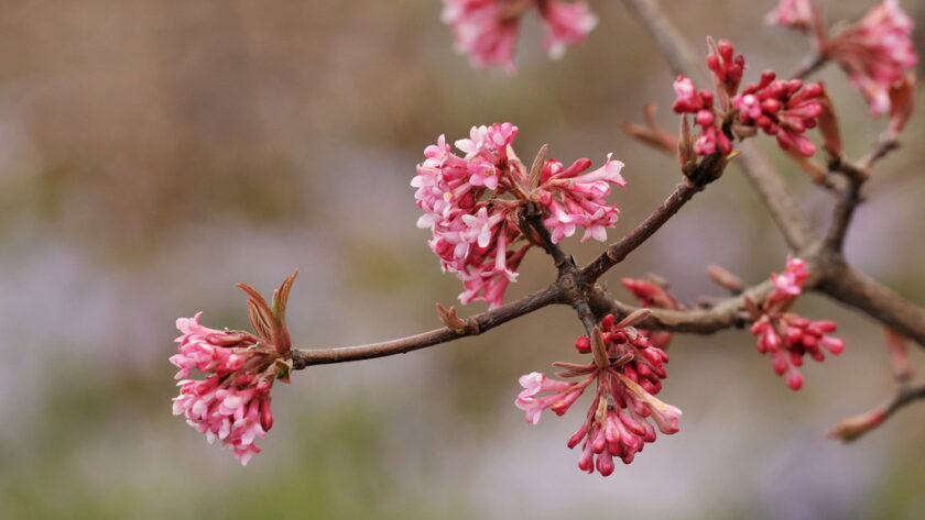 El híbrido Viburnum x bodnantense es un arbusto de hoja caduca muy valorado por sus flores, que visten las ramas desnudas en invierno, y especialmente apreciadas por la combinación de color y fragancia. Los numerosos y densos racimos de 7,5 cm de flores de color rosa o blanco rubor tienen un aroma muy dulce. En jardines de clima más frío, los arbustos florecen de enero a marzo, pero en inviernos suaves florecen de octubre a marzo, con un breve descanso. Los cultivares más conocidos son ‘Charles Lamont’, ‘Dawn’ y ‘Deben’. Ver más aquí: Viburnum x bodnantense, color y fragancia en el jardín de invierno