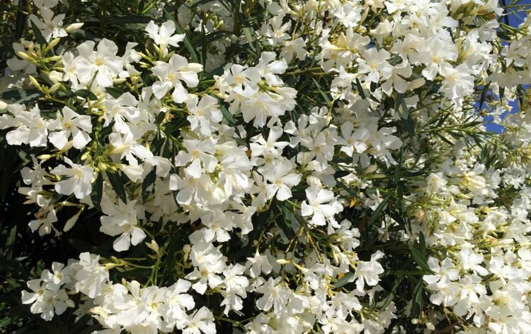 Mi adelfa favorita es la de flor blanca, con una floración espectacular que hace realmente difícil pensar que tras esa extraordinaria belleza se esconde el mal. Claro que, tal vez es una forma de advertirnos que los cánones de la belleza no siempre funcionan como nosotros los presentamos.