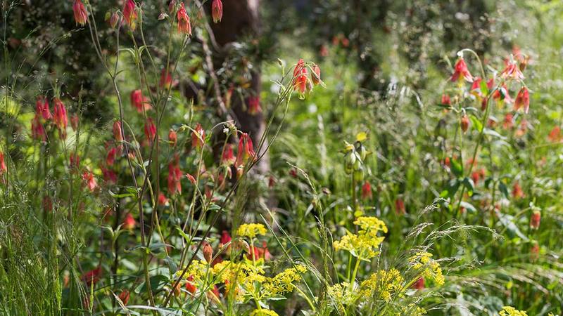 Un paisaje realmente evocador que Charlotte Harris ha sabido aprovechar en la creación de este jardín. Pinos maduros, cantos rodados de origen glaciar y un dosel de madera de alerce (Larix) revestido de cobre, que recuerda a los refugios creados por los cazadores y viajeros que exploran la orilla del río, son algunos de los elementos clave.