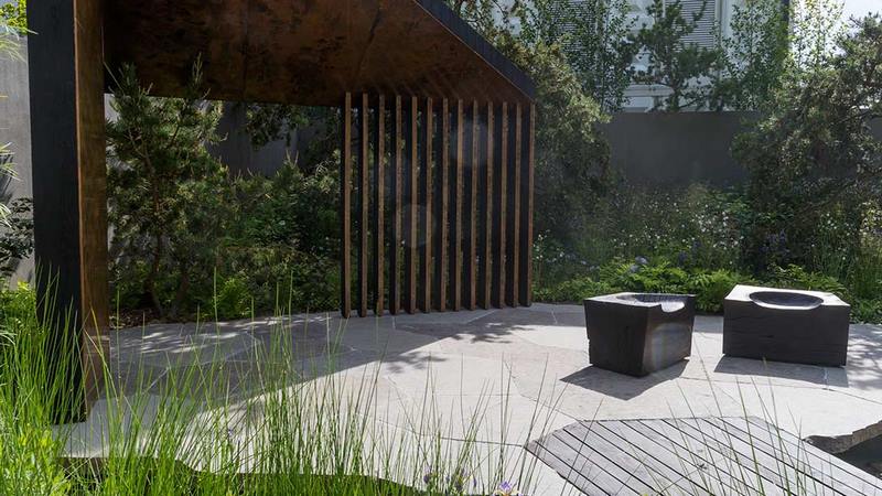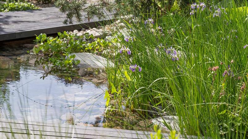Agua dulce, bosques, granito y madera, todo bien combinado han dado como resultado este jardín ganador y, además, bello.
