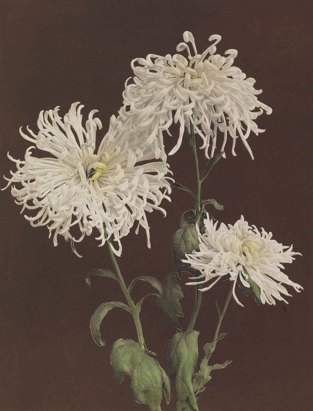 Buscaba algunas pinturas de crisantemos para ilustrar el otoño en el que ya indiscutiblemente estamos inmersos, pero en su lugar encontré fotografías, no solo de crisantemos, sino también de otras flores nativas de Japón, realizadas y editadas por Kazuma Ogawa durante la era Meiji.
