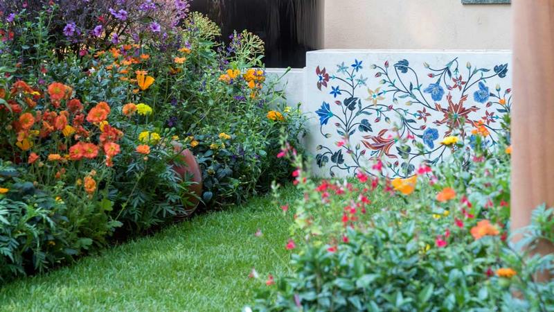Mucho más sofisticadas son las paredes frontales que se aprecian en el jardín British Council Garden – India: A Billion Dreams, diseñado por Sarah Eberle. Esas floridas paredes están insertadas con piedras semipreciosas en patrones intrincados.