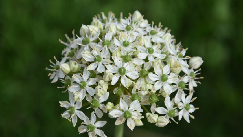Esas inflorescencias pueden parecer menos llamativas que las de otros ajos o cebollas ornamentales, pero a mí me resultan elegantes y versátiles, con una belleza que se adapta a muy diferentes estilos de plantación. Cada inflorescencia puede tener de 30 a 90 flores estrelladas con tépalos de color blanquecino y, como he dicho antes, el ovario central puede variar en color, que va de un verde claro a casi negro.
