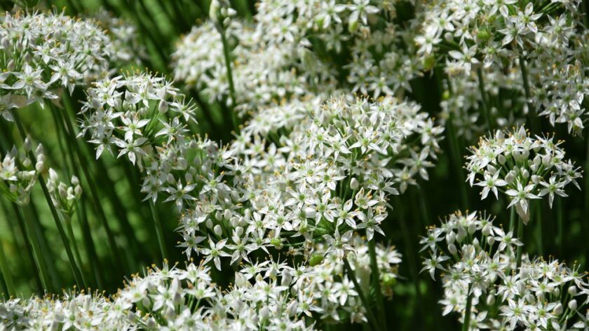 La última especie del género Allium en florecer. El cebollino chino (Allium tuberosum) es una planta culinaria con gran valor ornamental en jardines de bajo mantenimiento, gracias a las umbelas de flores blancas que produce profusamente al final del verano y principios del otoño que, además, resultan muy atractivas para los insectos polinizadores.