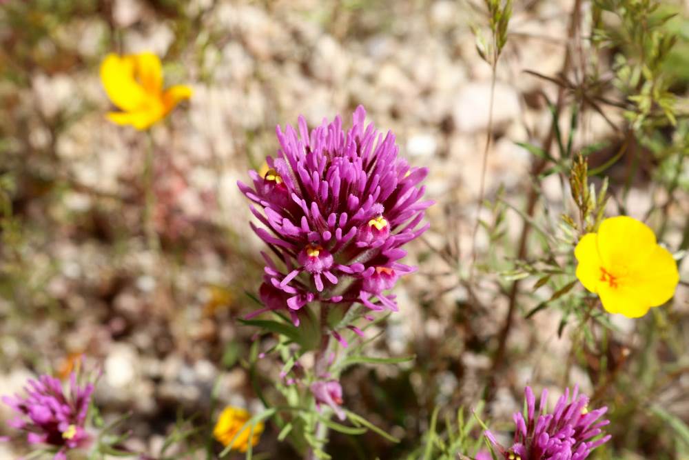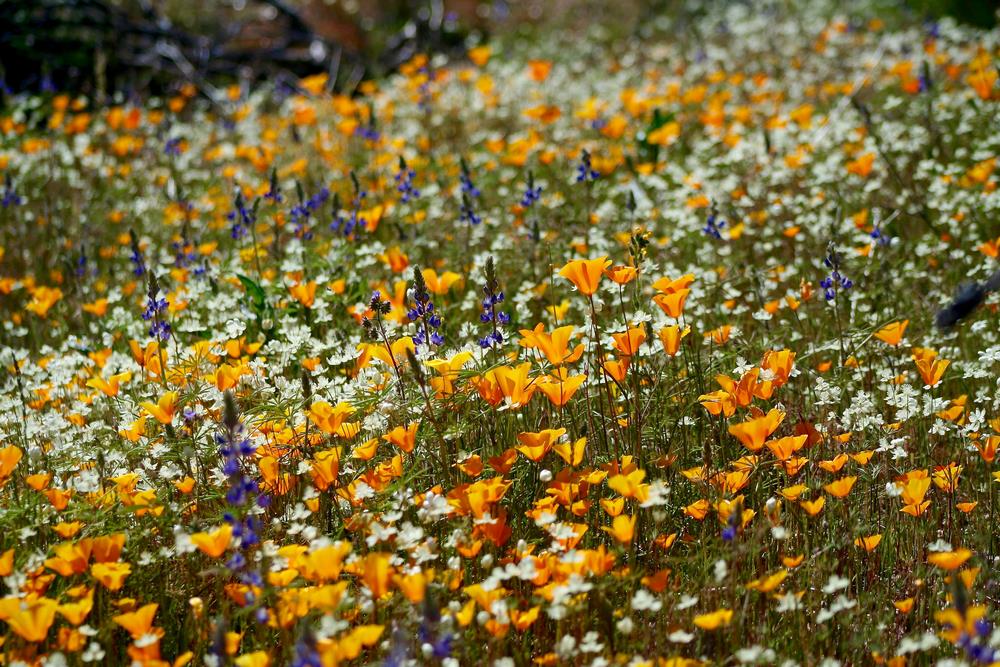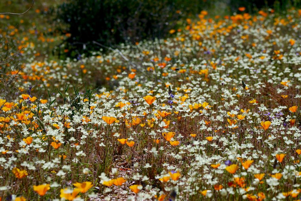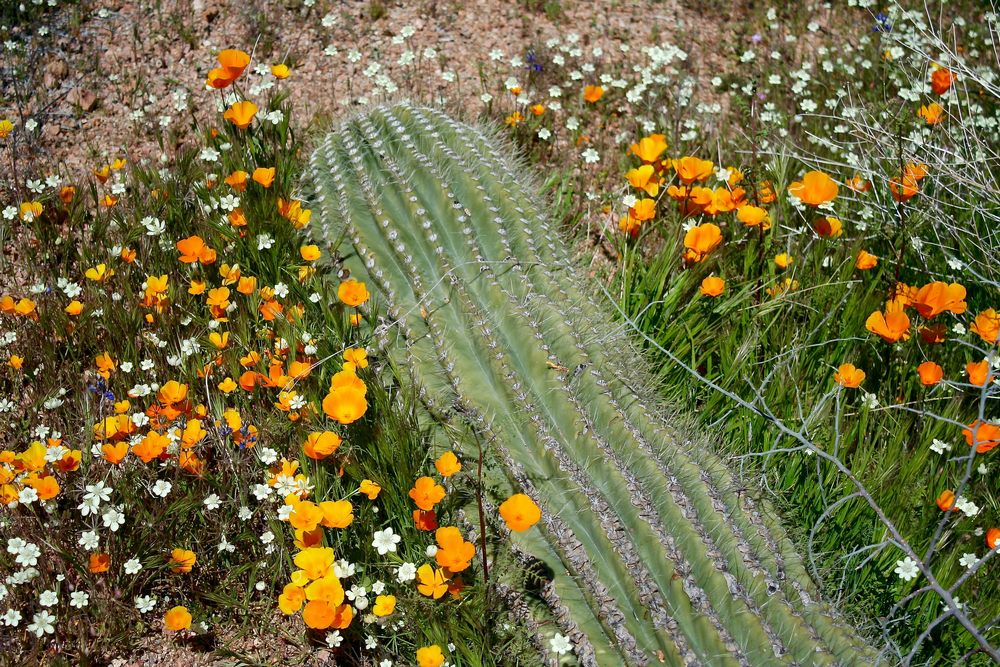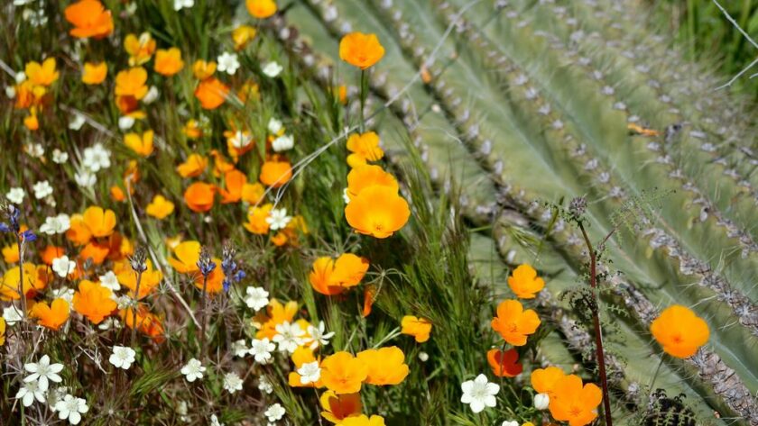Ya es sabido que cuando hay abundantes lluvias de invierno en el desierto las flores crecen profusamente y, en este caso, vemos cómo la amapola de oro mexicana también florece en abundancia y lo hace, junto a esculturales suculentas y, también, junto a otras flores silvestres del desierto, como Platystemom californicus, Gilia, Castilleja exserta y Lupinus. Prácticamente la misma comunidad de plantas que vimos en los paisajes de flores silvestres en la Reserva de Antelope Valley que mencioné antes.