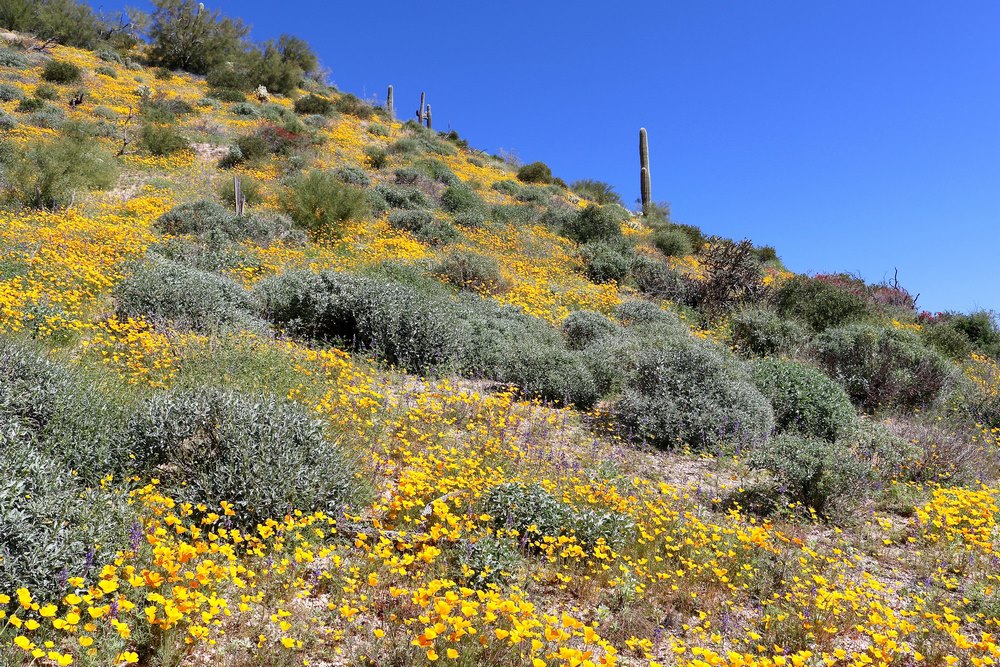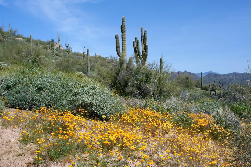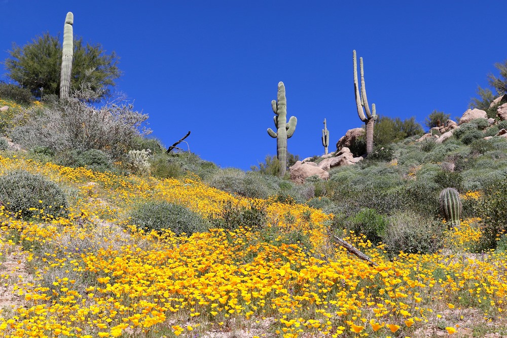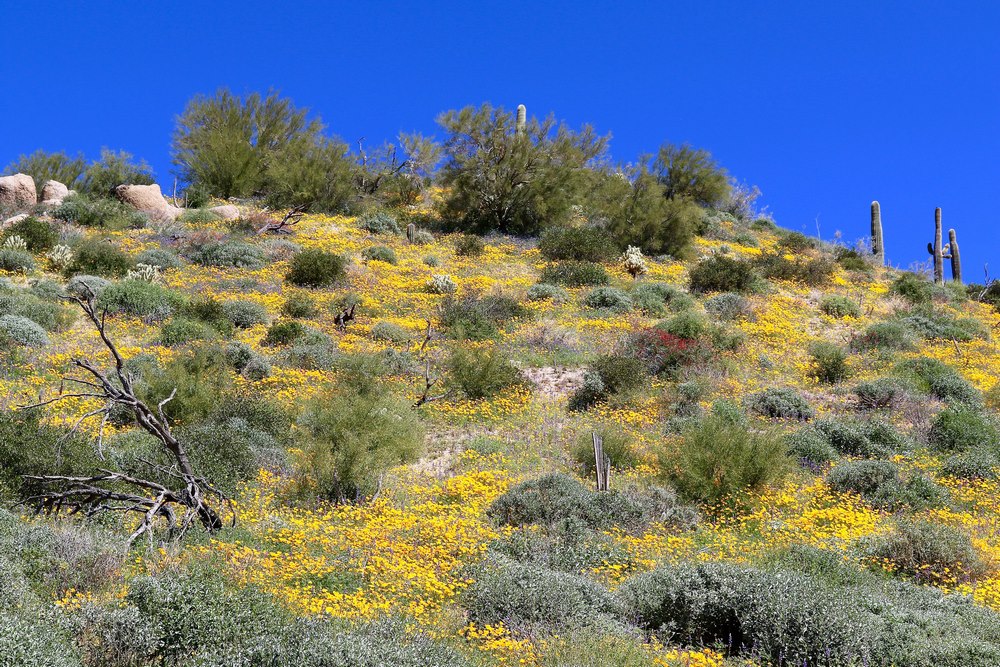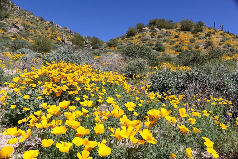 En esta ocasión, las imágenes nos muestran masas de amapolas de oro mexicana floreciendo en el mes de marzo en el desierto, concretamente al norte de Phoenix, Arizona (Estados Unidos).