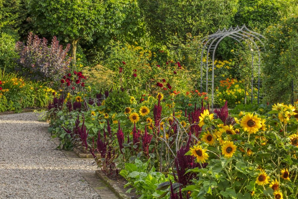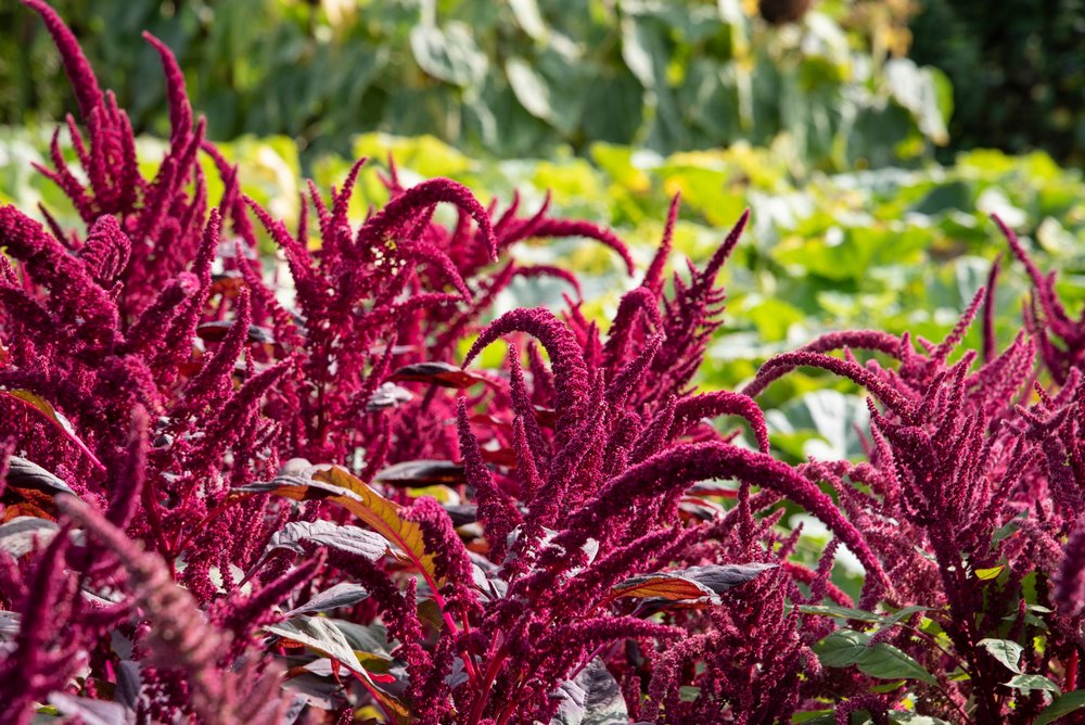 | Amarantos (Amaranthus) y girasoles (Helianthus annuus) en Morton Hall Gardens (Kitchen Garden) | Foto © Clive Nichols |