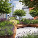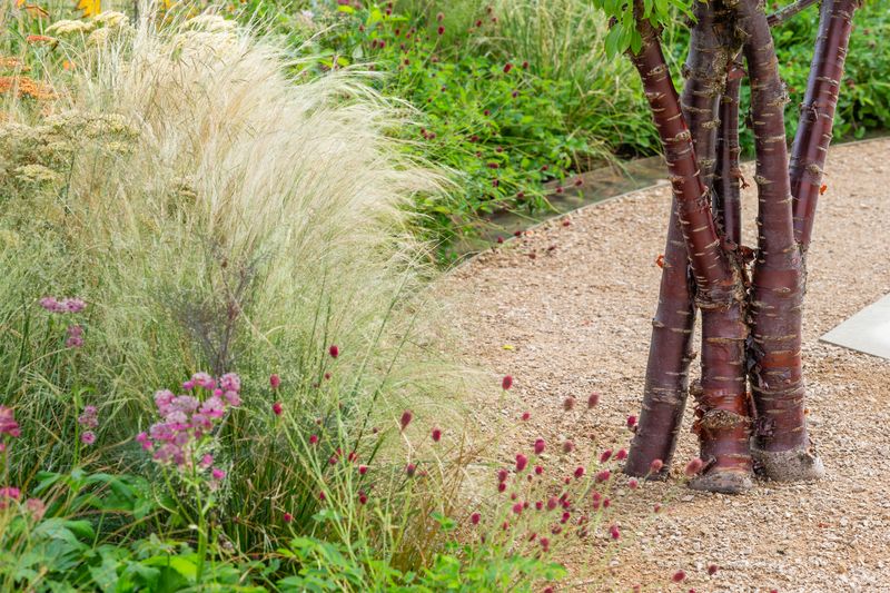 | Plantación de verano y Prunus serrula var. tibetica. RHS Flower Show Tatton Park 2018 •• © RHS / Neil Hepworth |