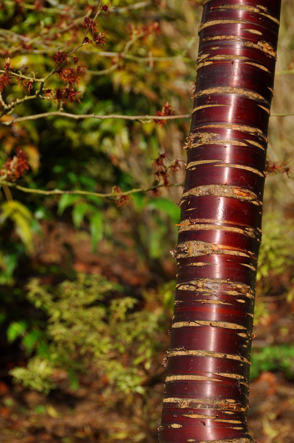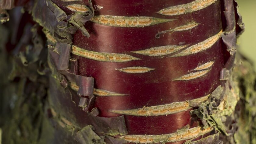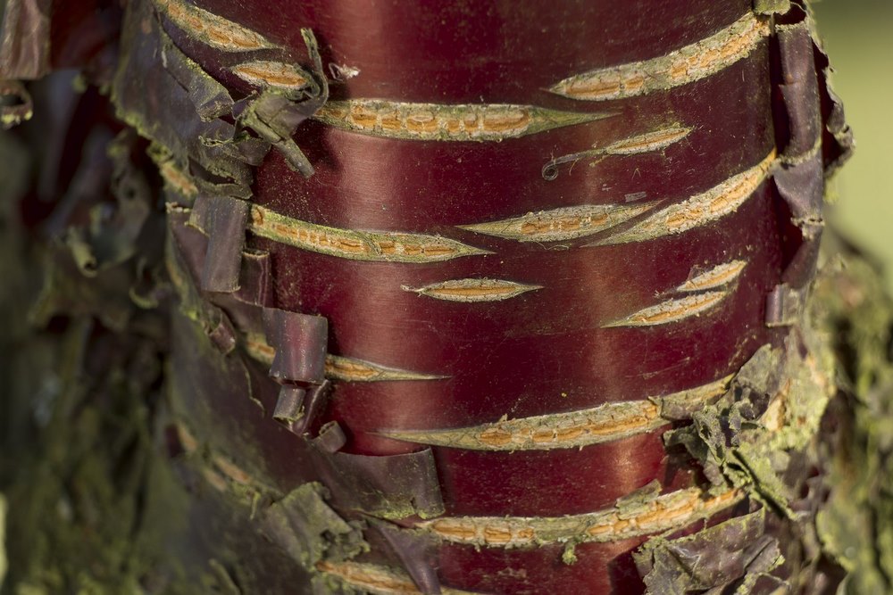 Probablemente una de las cortezas más elegantes, al menos desde mi punto de vista. Su tronco tiene un aspecto brillante, especialmente cuando el sol golpea la corteza lisa de color rojo intenso que está estructurada con muchas lenticelas. Este pequeño árbol lleva flores blancas en primavera y tiene follaje amarillo y bayas rojas en otoño, pero destaca en invierno por su atractivo tronco. Existen otras variedades con diferentes tonalidades en rosa, violeta o caoba.
