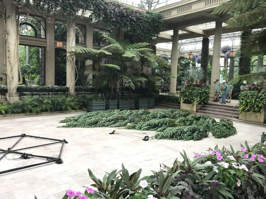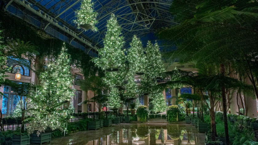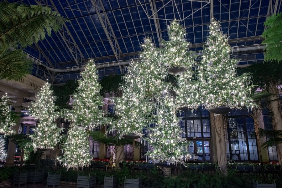 No cabe duda de que la actividad logística que existe detrás de la Navidad de Longwood Gardens funciona con maestría. Supongo que la amplia experiencia que tienen ayuda, así como el equipo humano, formado por profesionales cualificados en las diferentes áreas, que incluye arboristas, horticultores, electricistas, carpinteros, metalisteros, artesanos y diseñadores, entre otros profesionales. Todos ellos son responsables de lo que se podrá disfrutar estos días de fiesta en los diferentes jardines de Longwood, como, por ejemplo, este montaje navideño con 17 abetos suspendidos que han realizado en el Fern Path.