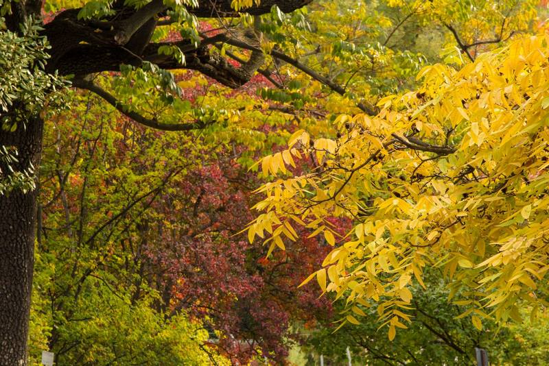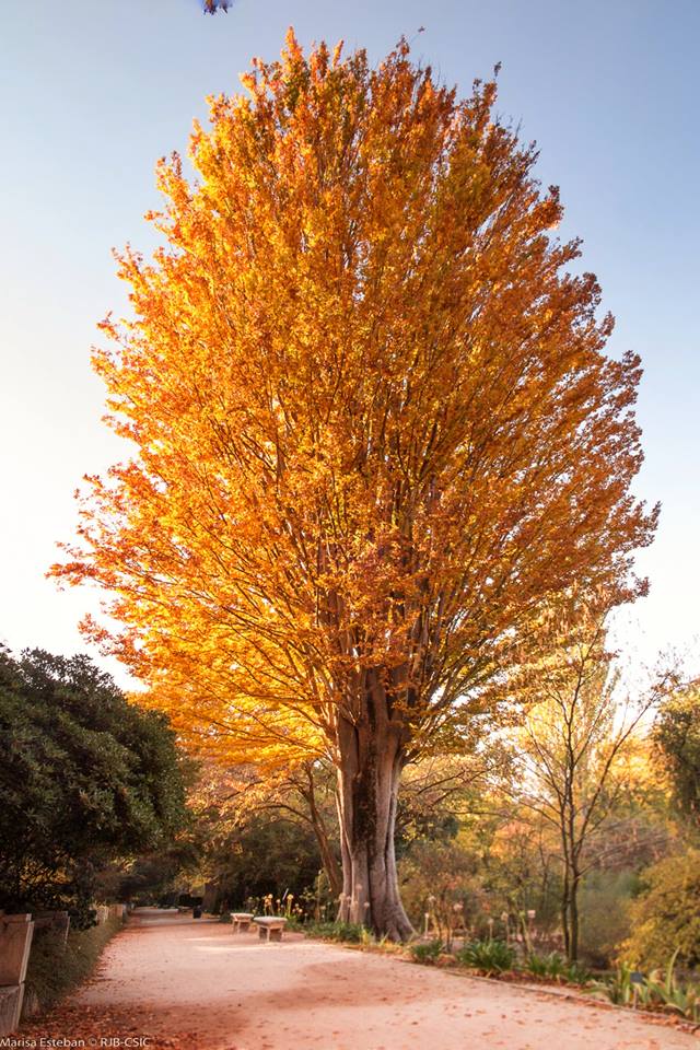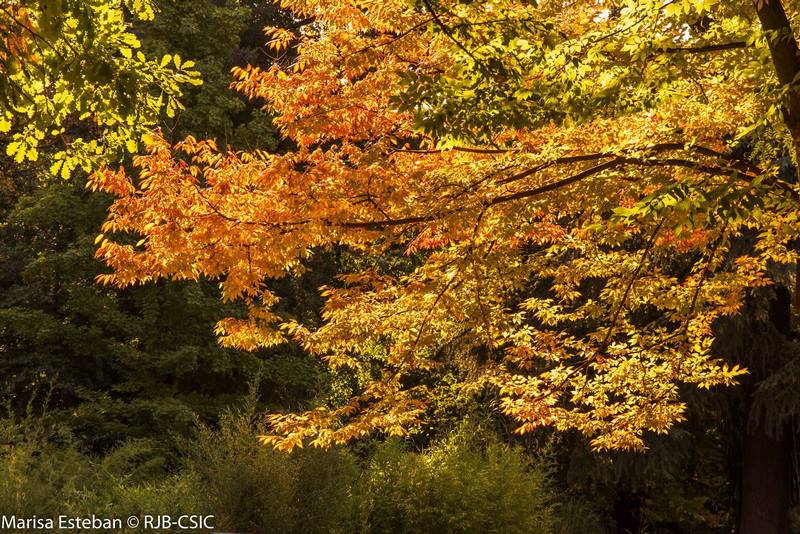 De repente, irrumpen las hojas doradas de Zelkova schneideriana del que nos cuenta que «es un árbol procedente de China donde es habitual encontrarlo próximo a lugares sagrados y templos antiguos. Solo se conservan poblaciones naturales en lugares inaccesibles y alejados de los núcleos de población humana.»