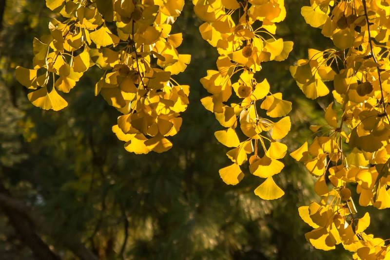 No pueden faltar en esa exhibición otoñal las hojas que caen «Como en cascadas de oro». Son las hojas del ginkgo (Ginkgo biloba) la especie viva más antigua de la Tierra. Se trata de un árbol de hoja caduca y porte elegante que puede alcanzar los 40 m de altura, con una corteza bastante suberosa y fisurada de color gris claro. Tenéis más detalles aquí: Longevidad y resistencia: Ginkgo biloba.